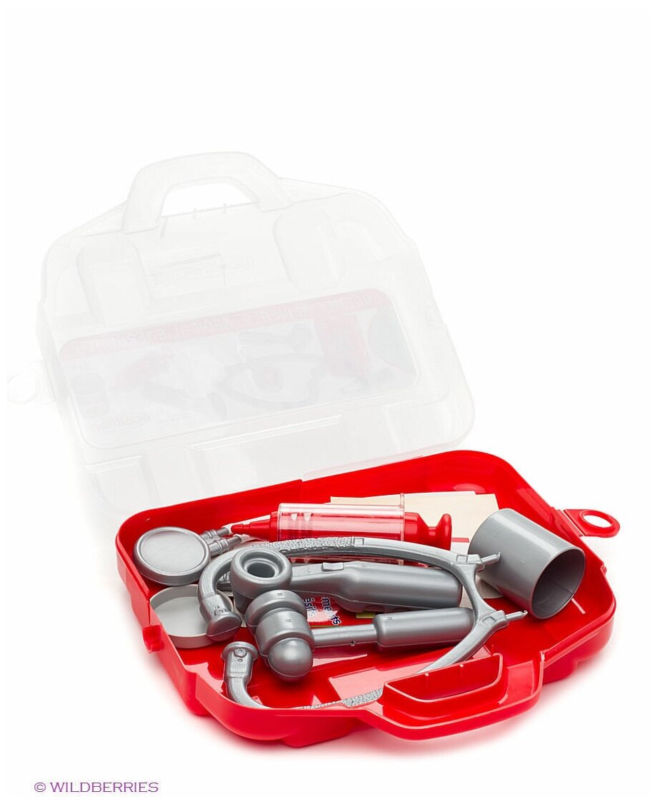 В комплекте градусник, неврологический молоток, шприц, ушное зеркальце, стетоскоп, баночка с лекарствами и коробочка с 10 пластырями.