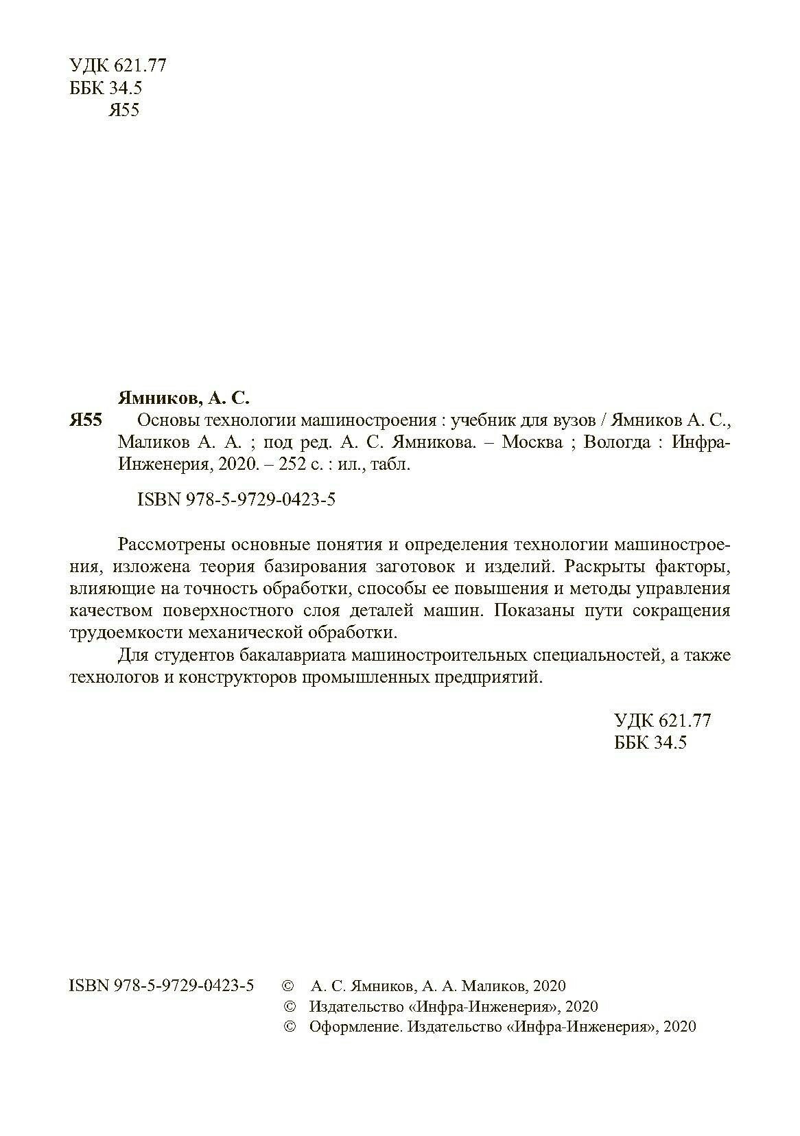 Основы технологии машиностроения. Учебник (Ямников Александр Сергеевич, Маликов Андрей Андреевич); Инфра-Инженерия, 2020