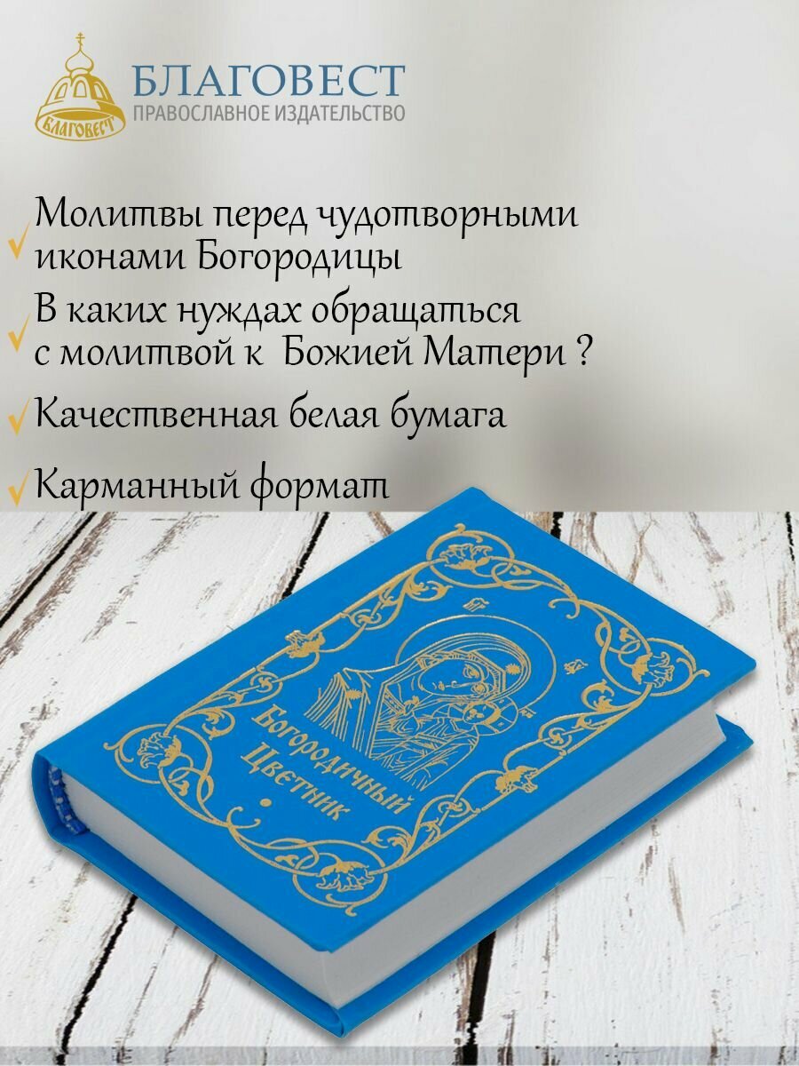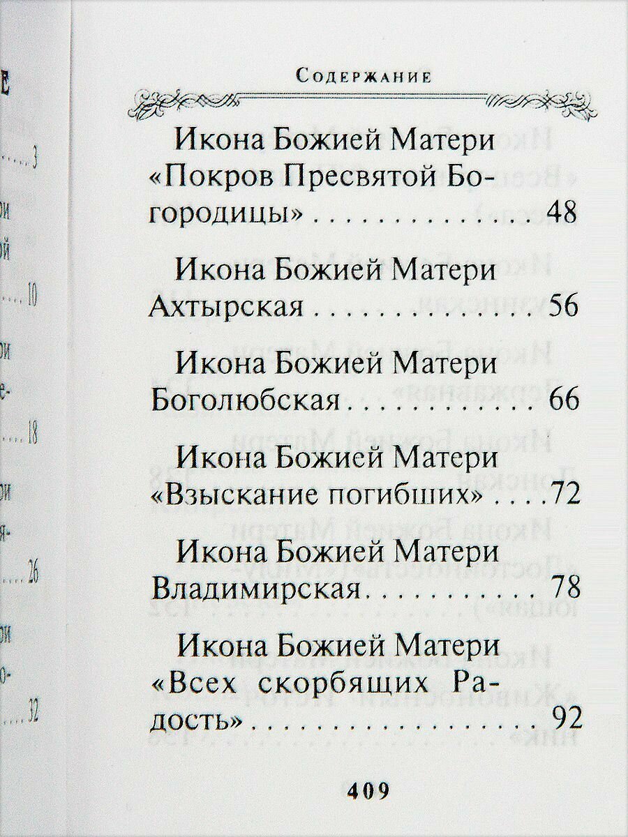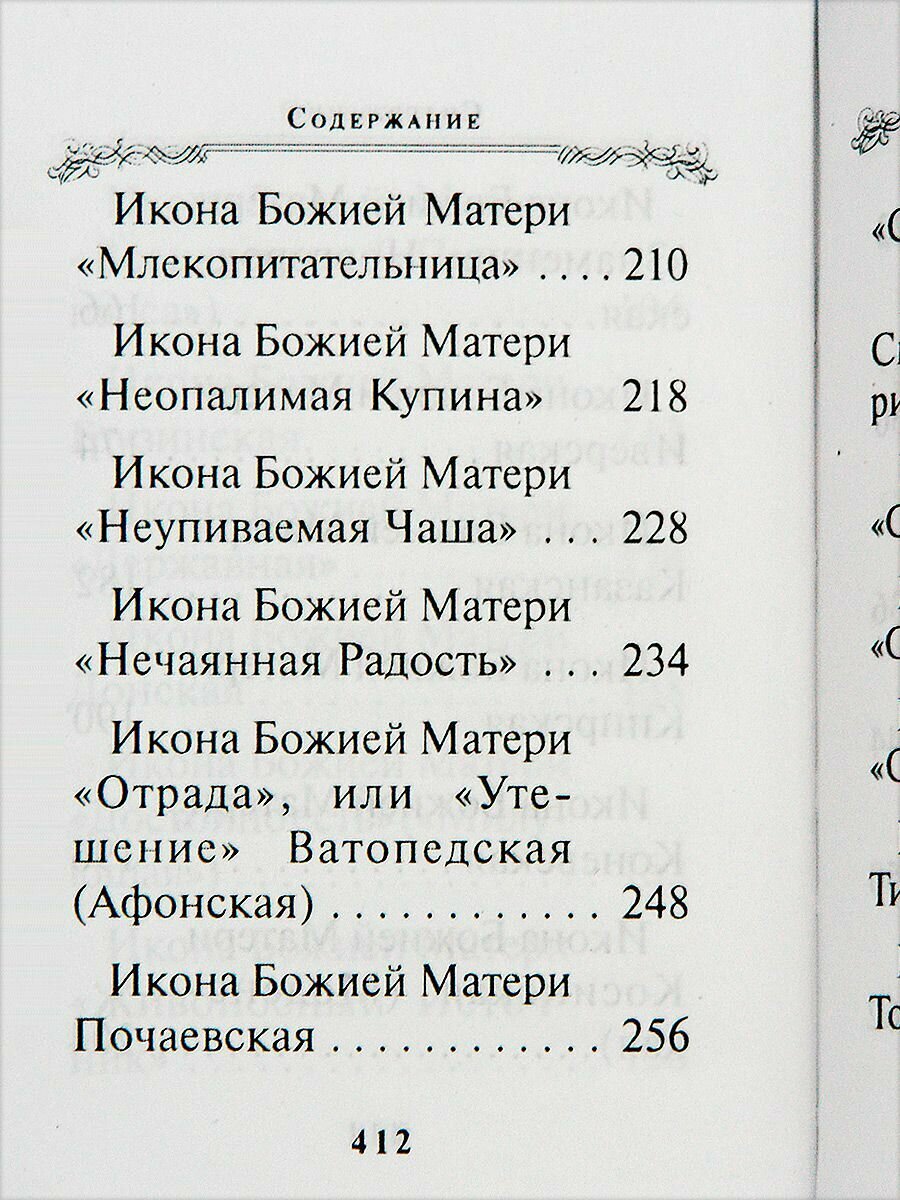 Содержит тропари, кондаки, величания и молитвы перед 44-мя чудотворными иконами Богородицы. Издана в карманном формате.