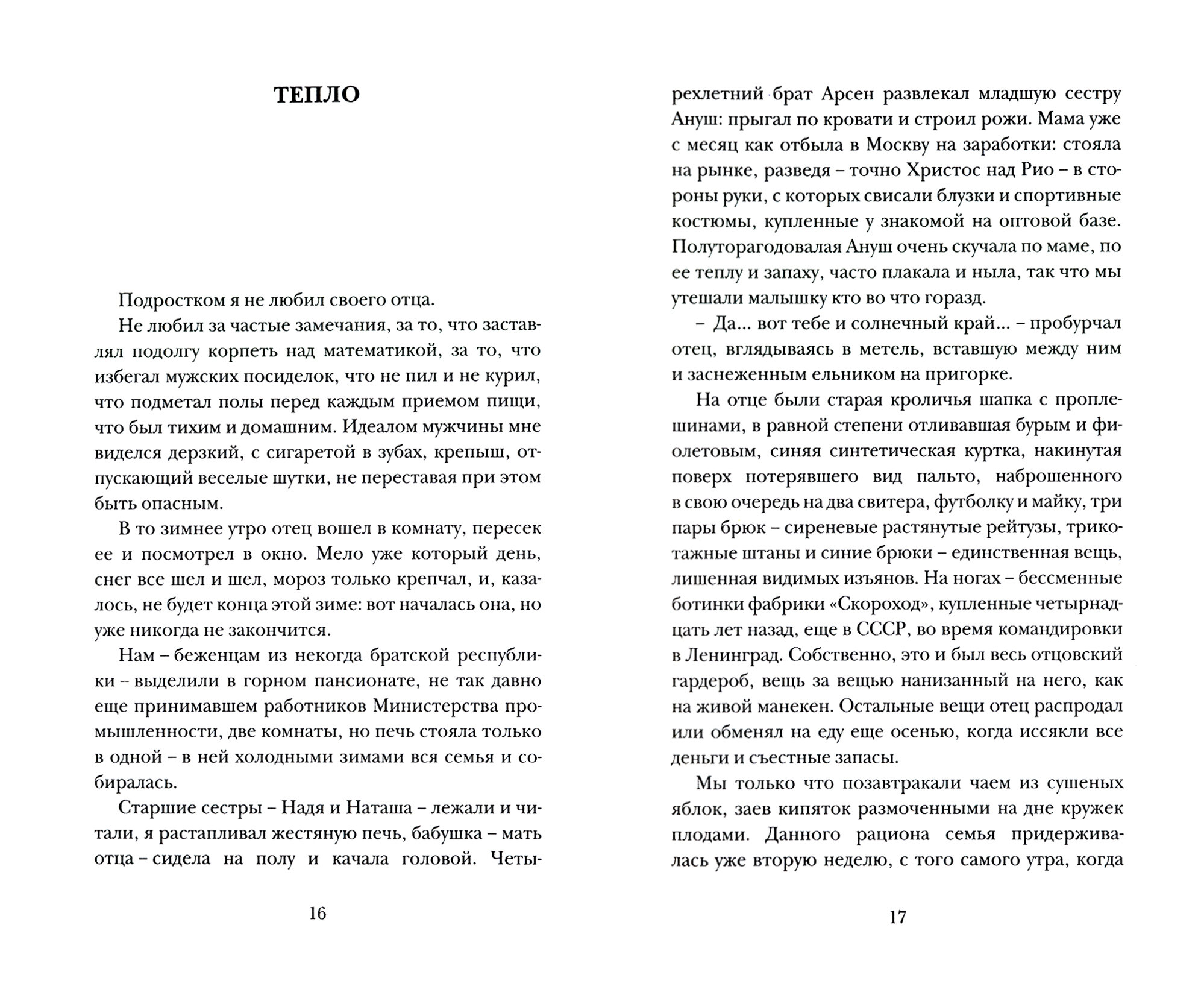 Писатель Валерий Айрапетян знаком мне по кругу авторов, которых в свое время публиковало издательство «ил мьюзик» (Алехин, Рябов, Леутин, Басыров и т.д.). Книга Айрапетяна «В свободном падении» вышла в «ил мьюзик» в 2013 году. Она не особо меня впечатлила по сравнению с другими книгами серии, а с тех пор об Айрапетяне я ничего не слышала. Когда я узнала, что у Айрапетяна вышла книжка в «Лимбусе», я обрадовалась – все-таки это уже не полуандеграундное издательство, а полноценный выход к читателю. Я с радостью купила книгу. Меня несколько разочаровало, что большая часть рассказов была перепечатана из старой книжки. Однако оказалось, что за шесть лет я все основательно подзабыла, поэтому почти все тексты прочитала как в первый раз. В целом, рассказы неплохие, но они как-то не очень собираются в цикл. Все они о разном – тут и рассказы о детстве, о родственниках и друзьях, и рассказы о практике времен учебы в медучилище, и абсолютно вымышленные тексты. В общем, видно, что рассказы написаны в разное время и по разным впечатлениям. Зато повесть «Дядьки» просто замечательна! Я вообще люблю автобиографические книги о детстве, а потому истории автора про своих дядюшек, да еще и с армянским колоритом, меня очень порадовали. Отличная, отличная повесть. Правда, на месте редактора, я бы включила в эту повесть отдельной главой и рассказ «Наставник», который опубликован в этой же книге среди других текстов, потому что он явно просится стать частью повести. В общем, хорошая книга, я была рада снова почитать Айрапетяна.