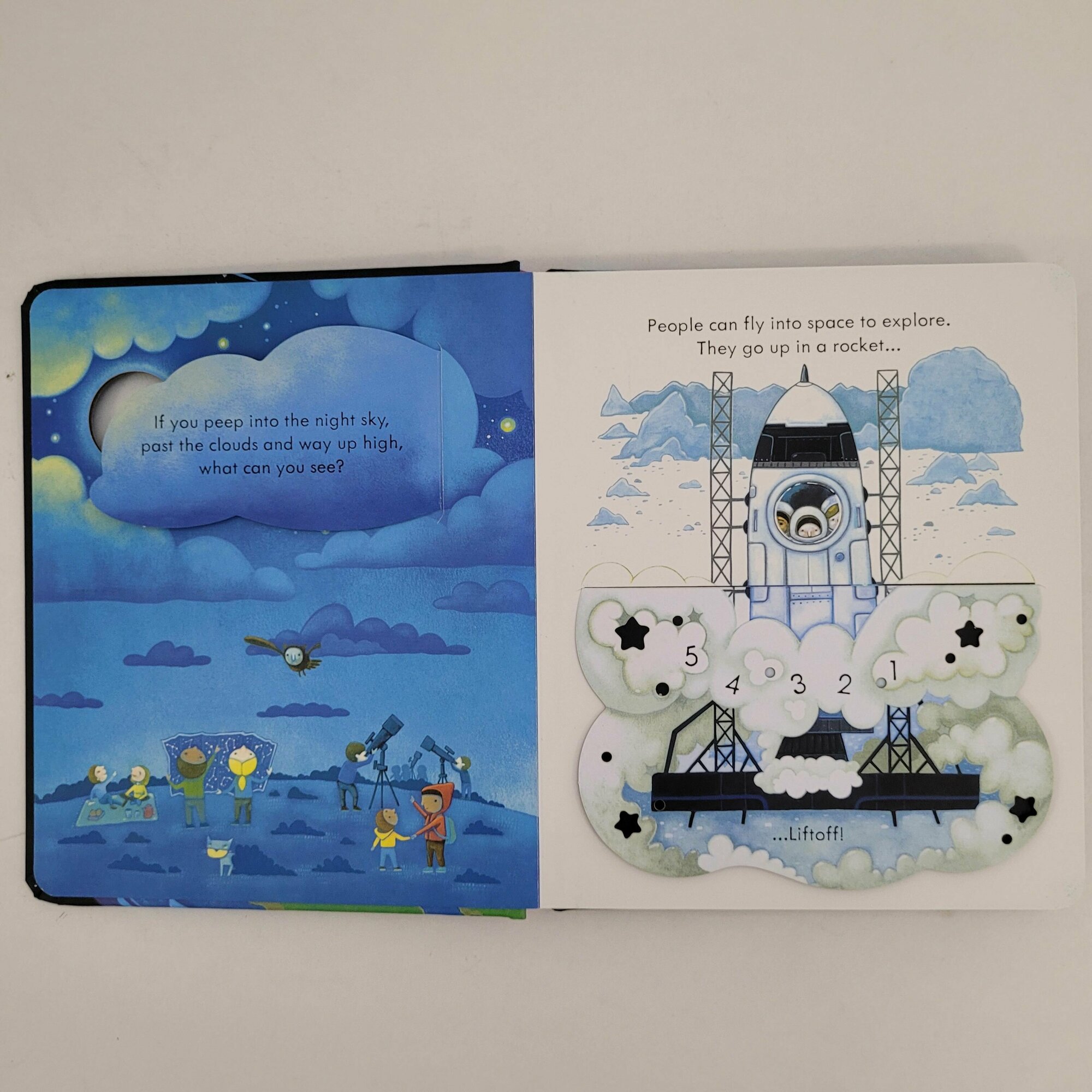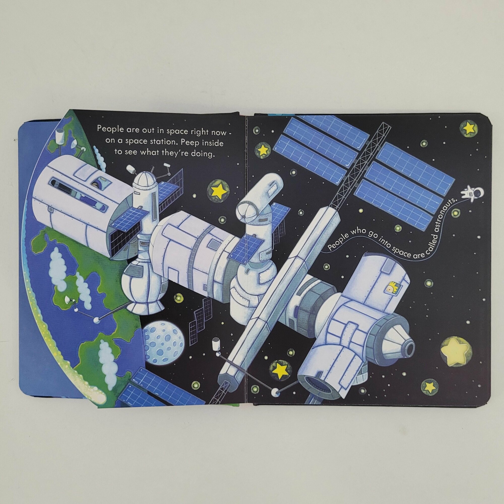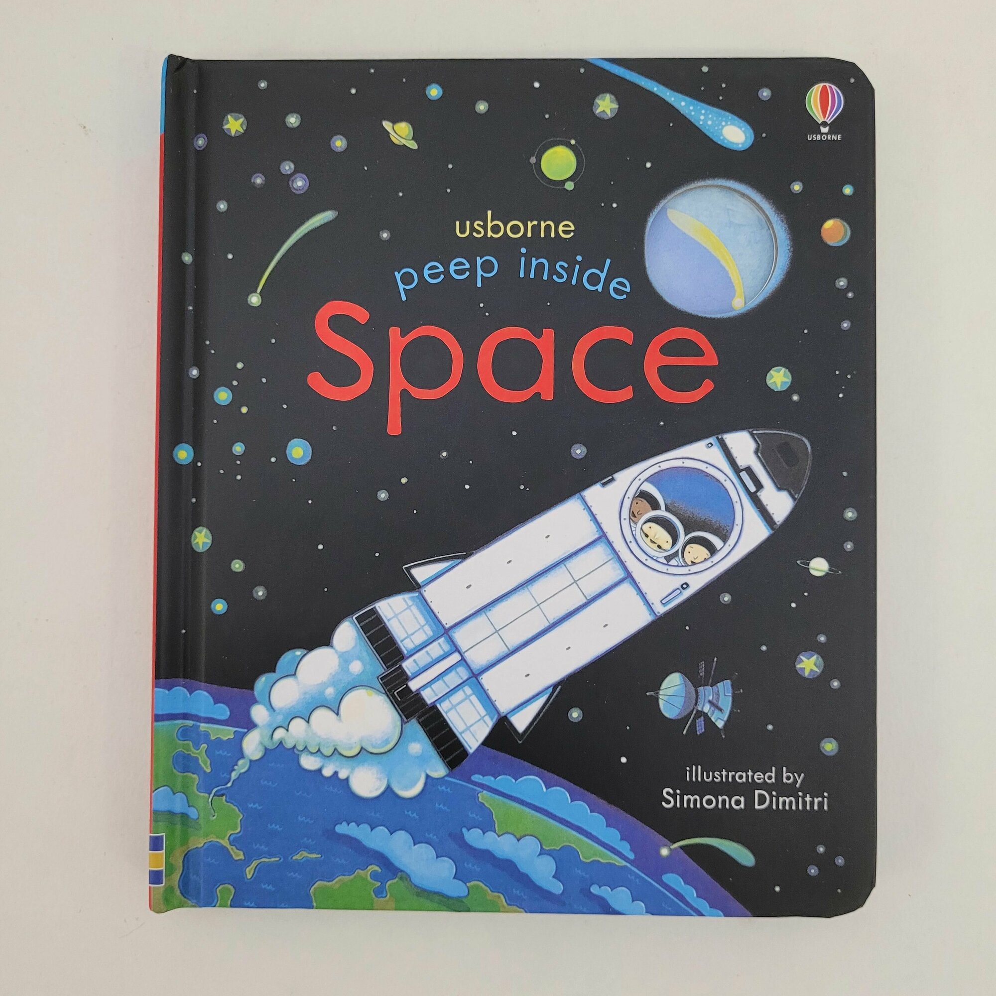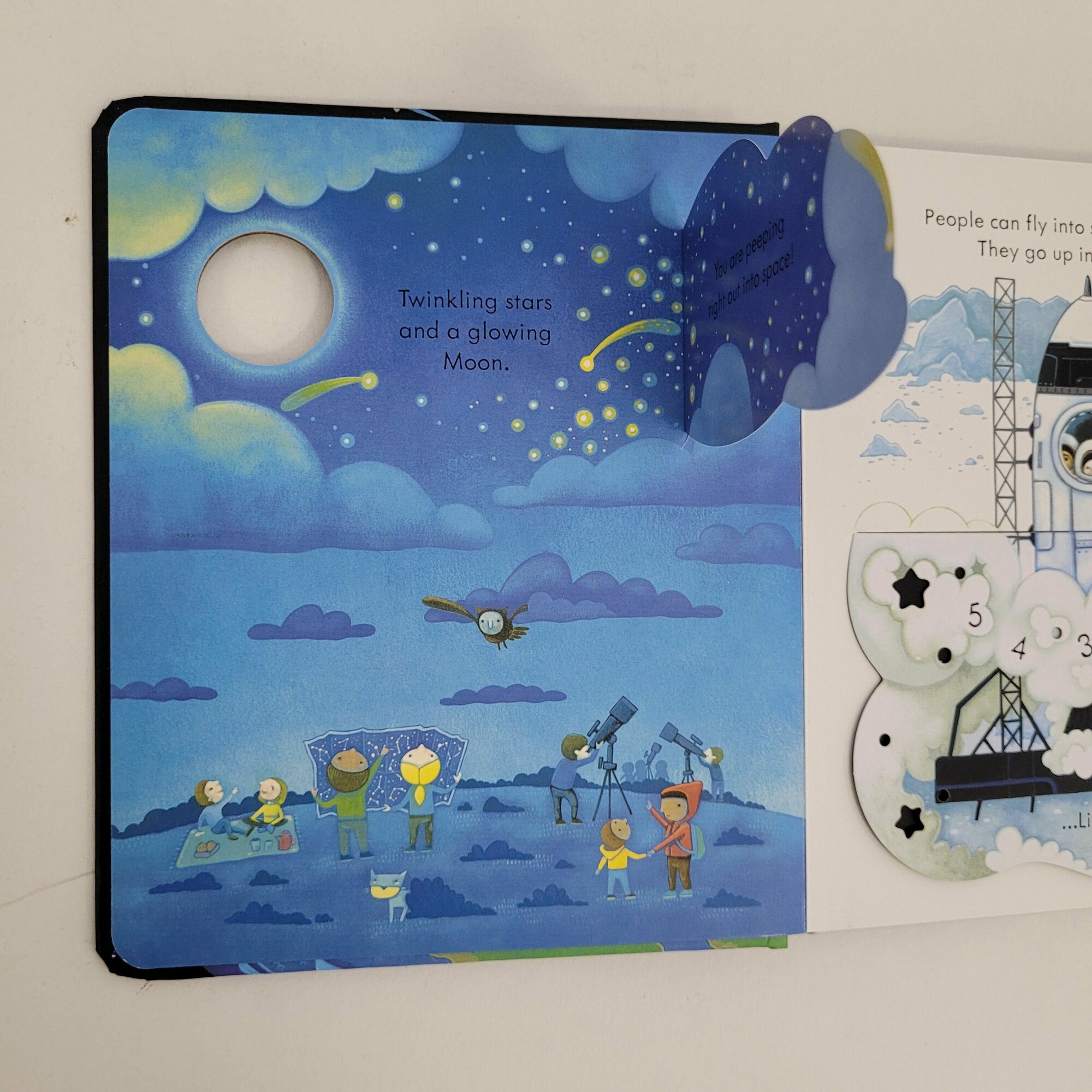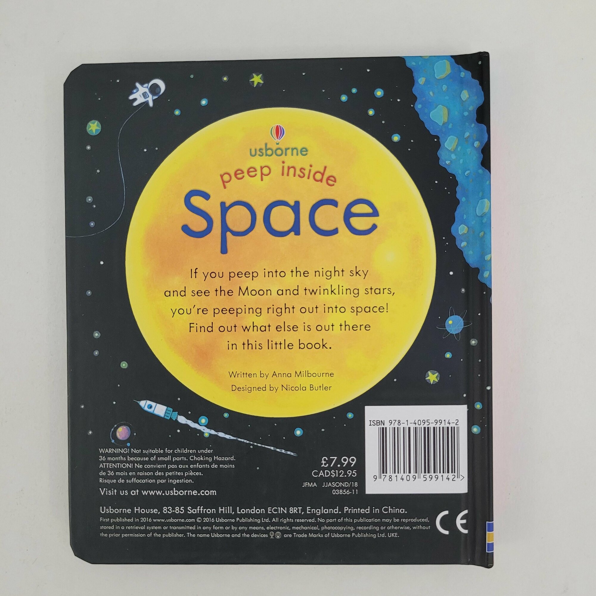 If you peep into the night sky and see the Moon and twinkling stars, you're peeping right out into space! Lift the flaps and peep through the holes in the pages to discover the planets in our solar system, see astronauts on the International Space Station and find out what else is in space in this beautifully illustrated book for little children.