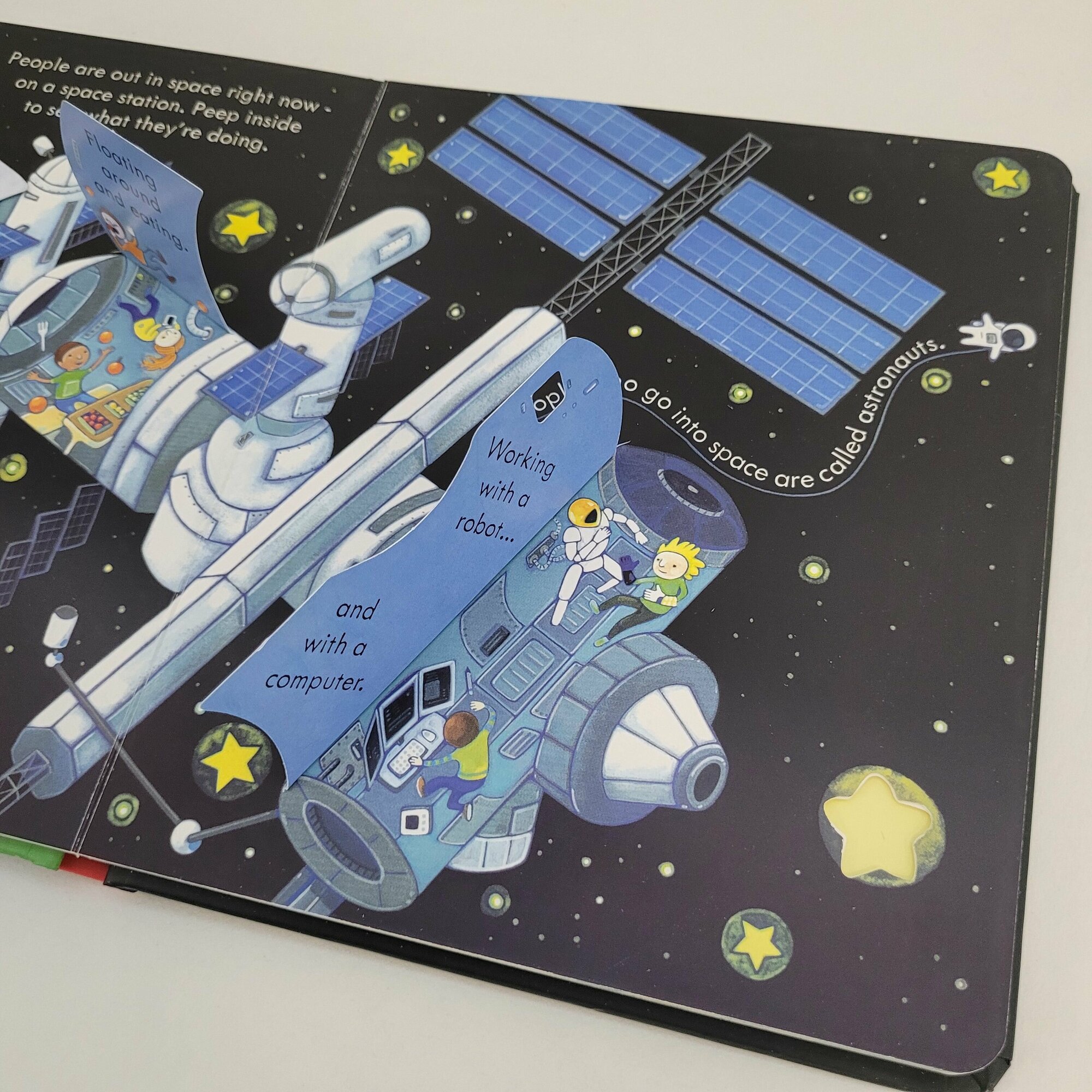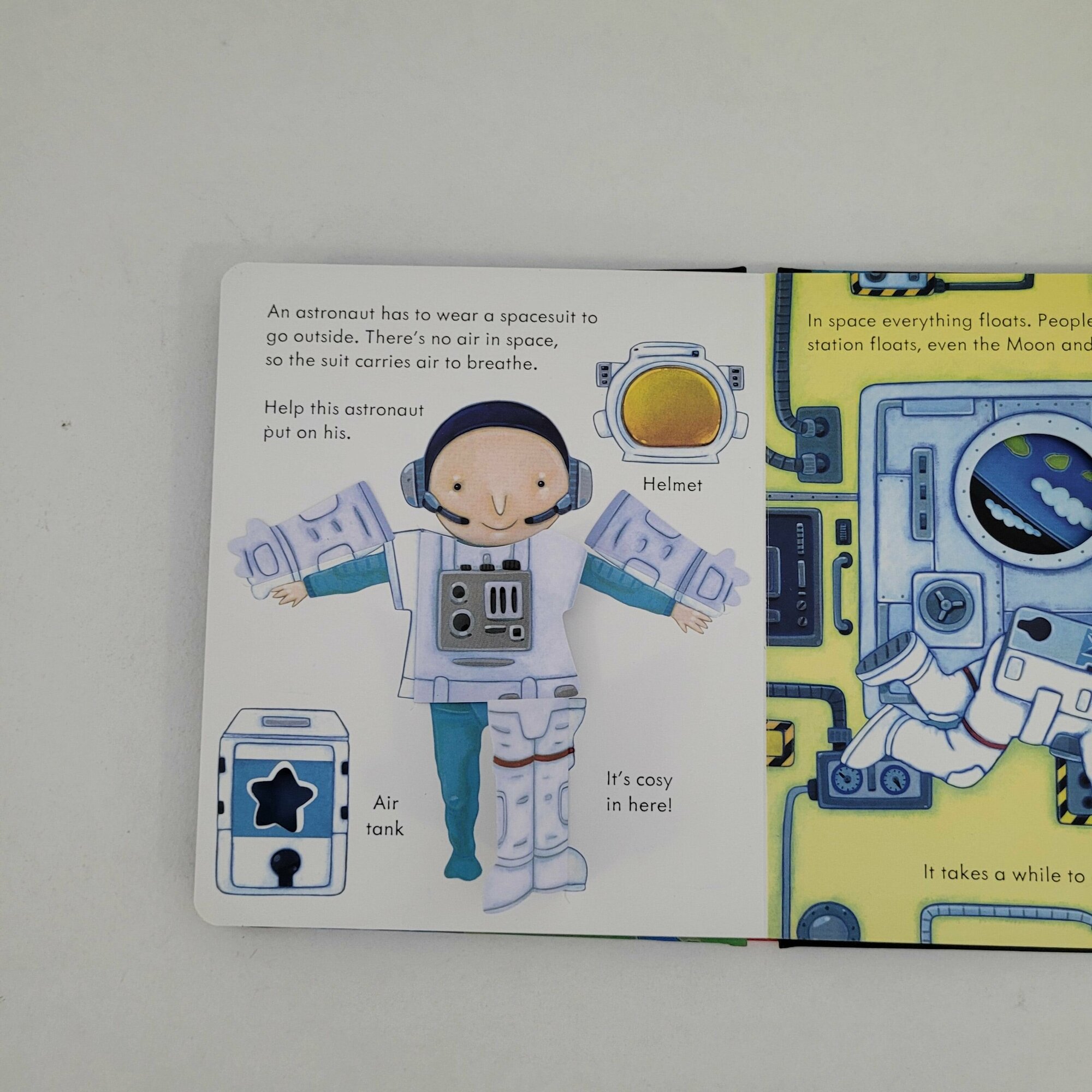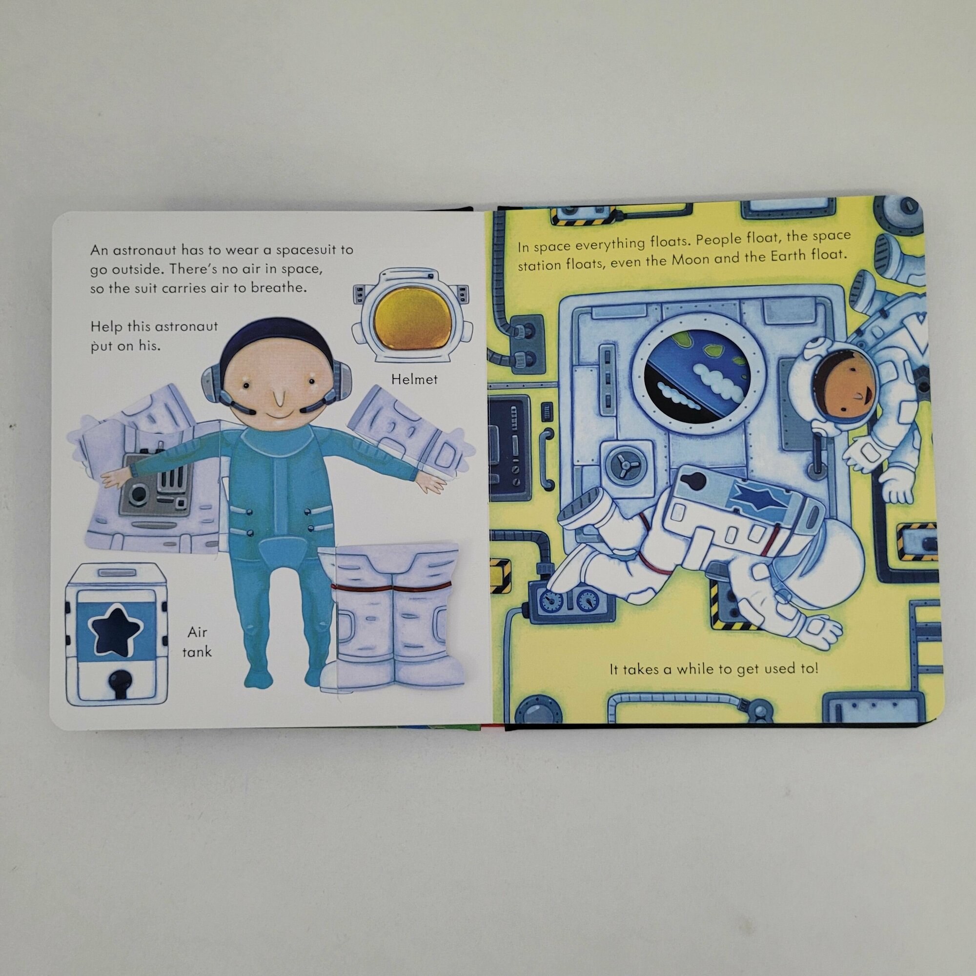 Очень красивая книга про космос ,ракеты,космонавтов! На каждом развороте несколько открывающихся створок ! Описание космоса очень небанальное,много новых слов для изучения английского! Вся серия просто чудесная! Плотная картонная обложка и страницы огромный плюс!!