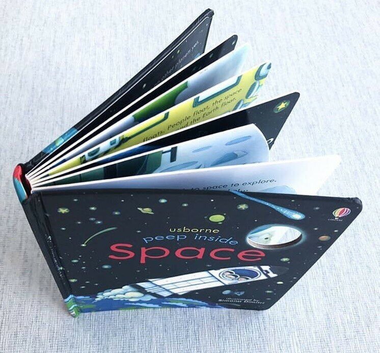 Замечательная книга от известного издательства Usborne. Книга среднего размера, что очень удобно для детских ручек. Данная книга из очень плотного картона с вырубкой и флэпами подойдёт на возраст от 2-х лет. Вообще вся серия peep inside очень качественная и интересная. Книга про космос хорошо познакомит детей с этой темой, это готовый глоссарий для обучения. Также здесь есть небольшие задания. Рекомендую!