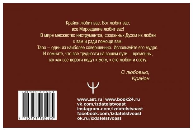 Божественный дух Крайон обращает наше внимание на то, что на изменившейся Земле предсказанияперестали работать, как раньше, предопределенности больше не существует, мы сами — творцы своей судьбы!Но и сейчас астрология, нумерология, карты Таро и все древние оракулы — это прекрасные инструменты Духа, инструменты передачи Божественного знания, призванные помогать нам и поддерживать нас. Древние оракулы — это способ неясное знание сделать более отчетливым, непонятное — разъяснить, невнятное — «перевести» на понятный для вас язык.В книге вы найдете: подробные ответы Крайона на вопросы о картах Таро, уникальную методику работыс картами Таро Уэйта, послания Крайона, соответствующие значениям каждой карты, комментарии, помогающие правильно их понять, практические упражнения-визуализации, нацеленные на то, чтобы извлечьпозитивные возможности из вашей жизненной ситуации и сделать лучший выбор из возможных.Карты таро в комплект не входят.