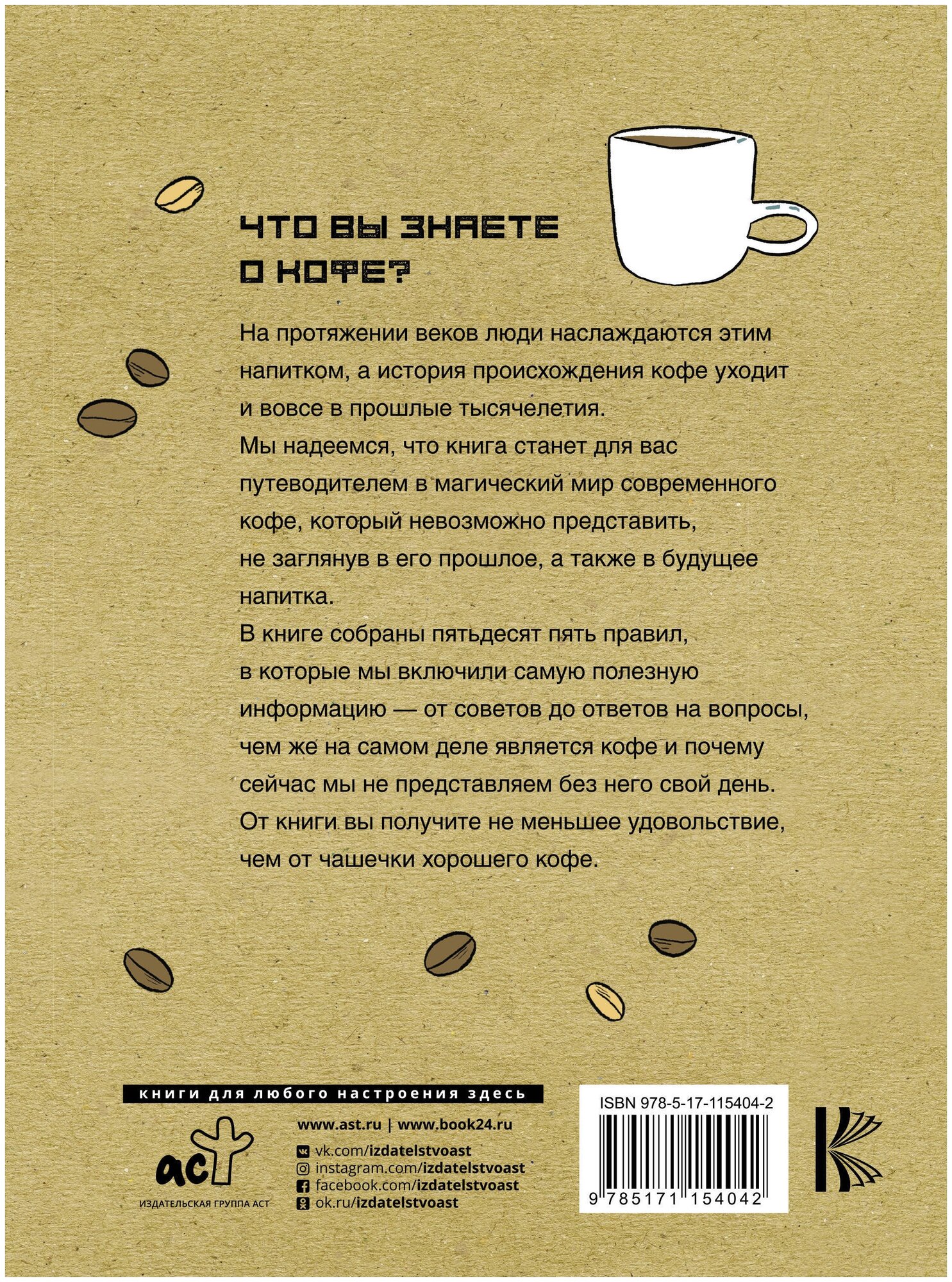 Что вы знаете о кофе? На протяжении веков люди наслаждаются этим напитком, а история происхождения кофе уходит и вовсе в прошлые тысячелетия. Мы надеемся, что книга станет для вас путеводителем в магический мир современного кофе, который невозможно представить, не заглянув в его прошлое, а также в будущее напитка. В книге собраны пятьдесят пять правил, в которые мы включили самую полезную информацию — от советов до ответов на вопросы, чем же на самом деле является кофе и почему сейчас мы не представляем без него свой день. От книги вы получите не меньшее удовольствие чем от чашечки хорошего кофе.