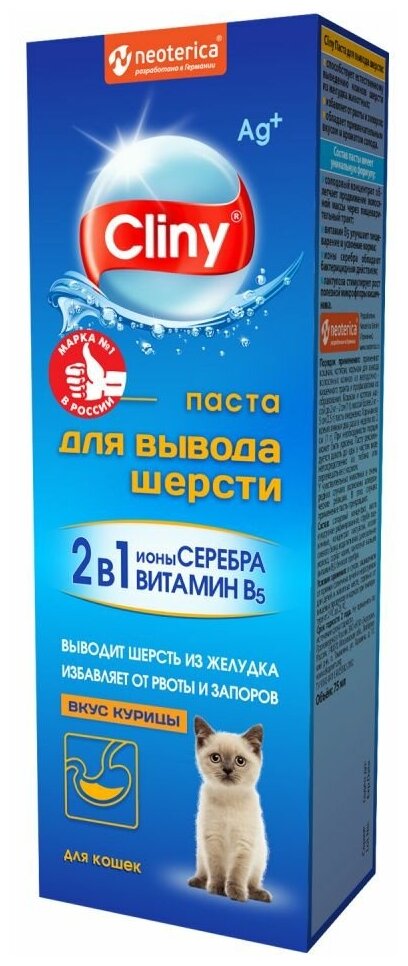 Паста для вывода шерсти Cliny способствует естественному выведению комков шерсти (безоаров) из желудка животных. Избавляет кошек от рвоты, потери аппетита, закупорки кишечника, запоров. Обладает привлекательным для кошек вкусом курицы.