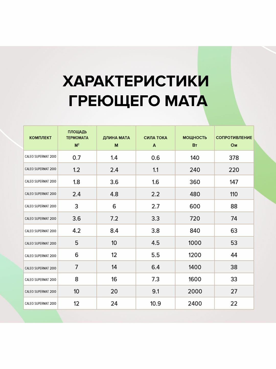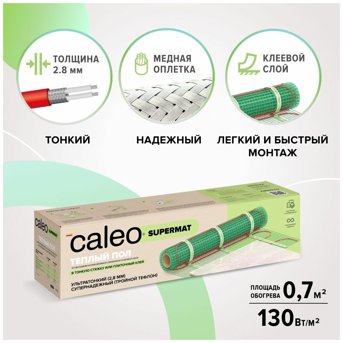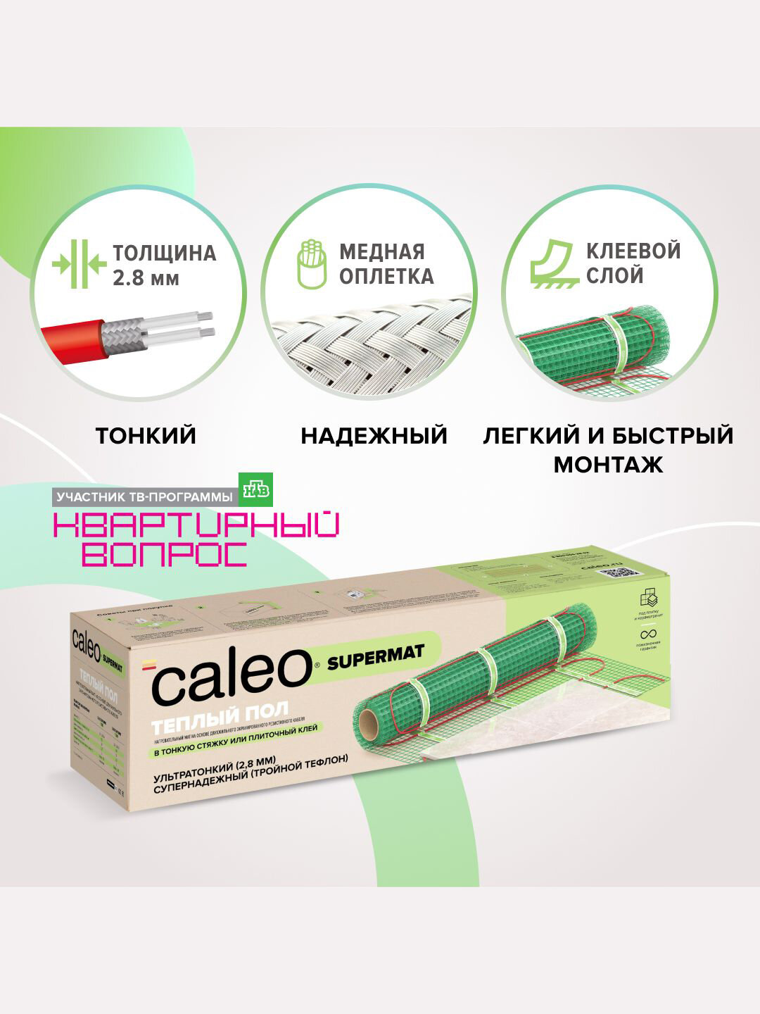 | Прочие особенности и свойства | Предназначен для монтажа в тонкую стяжку, плиточный клей или наливной пол. Обеспечивает подогрев поверхности пола для создания дополнительного комфорта в помещении. Может монтироваться как в стандартных, так и холодных помещениях. Удобная, с постоянным шагом раскладка кабеля на сетке позволяет осуществить легкий и быстрый монтаж термомата на любых поверхностях даже сложных конфигураций.,,Особенности CALEO SUPERMAT,• Сверхтонкий нагревательный мат повышенной надежности.,• 130 Вт/м2 — для стандартных помещений.,• 200 Вт/м2 — для холодных помещений (первые и цокольные этажи, утепленные балконы и лоджии, веранды, загородные дома и т.д.).,• Ультратонкий — 2-2,8 мм толщина нагревательного кабеля.,• Наружная и внутренняя изоляция из высокотемпературного фторполимера.,• Экран в виде оплетки из медной луженой проволоки.,• Сетка с клеевым слоем для удобства фиксации мата к полу при монтаже.,• Гарантия — 50 лет.,,Основные преимущества CALEO SUPERMAT,• Сверхтонкий — один из самых тонких:на 30...50% тоньше аналогов — 2-2,8 мм.,• Надежный — один из самых надежных:один из немногих, имеющих полноценный экран в виде сетчатой оплетки из луженной меди. Единственный, у которого все слои изоляции — высокотемпературные (из фторполимера).,• Удобный — один из самых удобных |