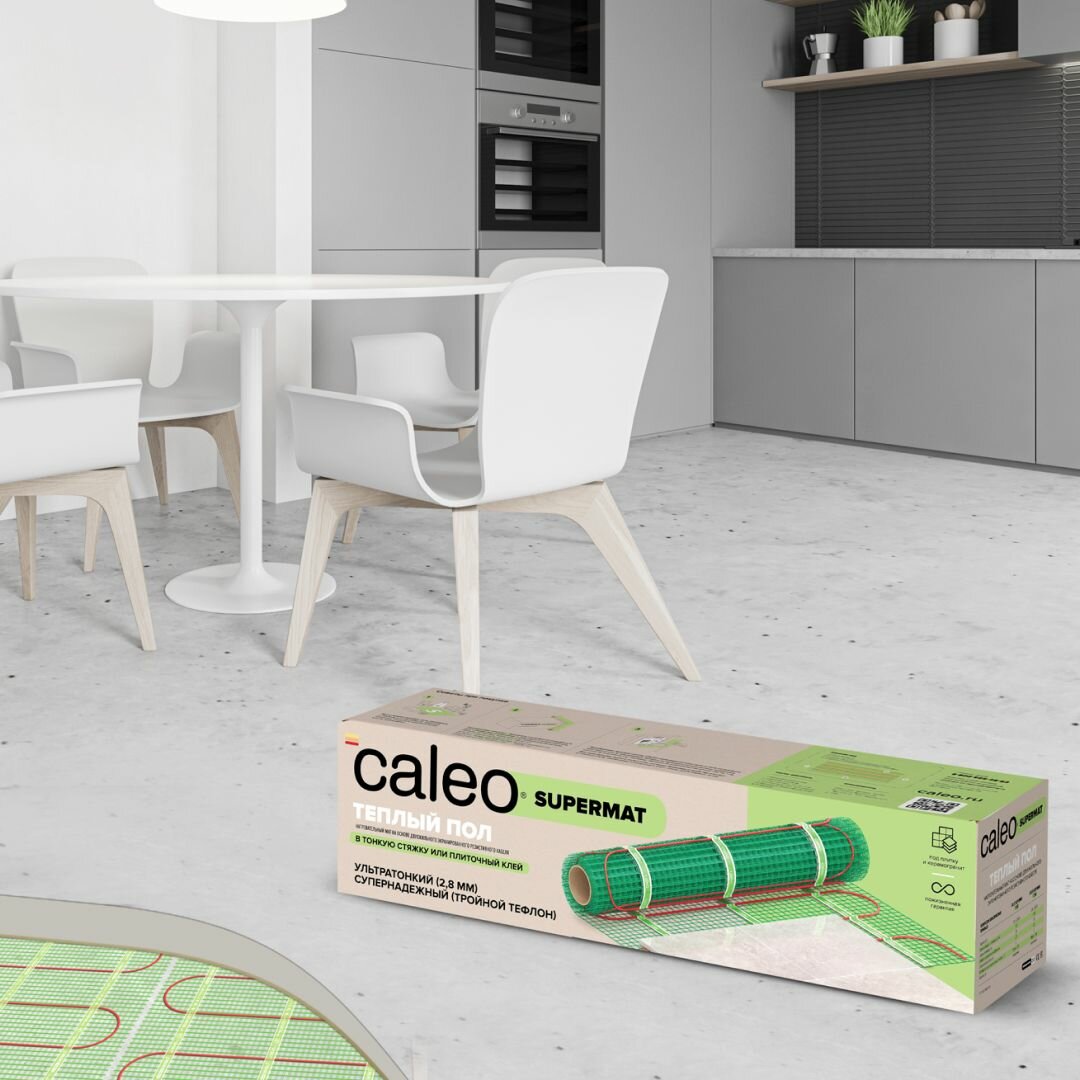 | Прочие особенности и свойства | Предназначен для монтажа в тонкую стяжку, плиточный клей или наливной пол. Обеспечивает подогрев поверхности пола для создания дополнительного комфорта в помещении. Может монтироваться как в стандартных, так и холодных помещениях. Удобная, с постоянным шагом раскладка кабеля на сетке позволяет осуществить легкий и быстрый монтаж термомата на любых поверхностях даже сложных конфигураций.,,Особенности CALEO SUPERMAT,• Сверхтонкий нагревательный мат повышенной надежности.,• 130 Вт/м2 — для стандартных помещений.,• 200 Вт/м2 — для холодных помещений (первые и цокольные этажи, утепленные балконы и лоджии, веранды, загородные дома и т.д.).,• Ультратонкий — 2-2,8 мм толщина нагревательного кабеля.,• Наружная и внутренняя изоляция из высокотемпературного фторполимера.,• Экран в виде оплетки из медной луженой проволоки.,• Сетка с клеевым слоем для удобства фиксации мата к полу при монтаже.,• Гарантия — 50 лет.,,Основные преимущества CALEO SUPERMAT,• Сверхтонкий — один из самых тонких:на 30...50% тоньше аналогов — 2-2,8 мм.,• Надежный — один из самых надежных:один из немногих, имеющих полноценный экран в виде сетчатой оплетки из луженной меди. Единственный, у которого все слои изоляции — высокотемпературные (из фторполимера).,• Удобный — один из самых удобных |