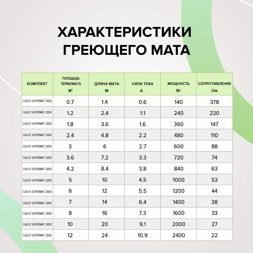 | Прочие особенности и свойства | Предназначен для монтажа в тонкую стяжку, плиточный клей или наливной пол. Обеспечивает подогрев поверхности пола для создания дополнительного комфорта в помещении. Может монтироваться как в стандартных, так и холодных помещениях. Удобная, с постоянным шагом раскладка кабеля на сетке позволяет осуществить легкий и быстрый монтаж термомата на любых поверхностях даже сложных конфигураций.,,Особенности CALEO SUPERMAT,• Сверхтонкий нагревательный мат повышенной надежности.,• 130 Вт/м2 — для стандартных помещений.,• 200 Вт/м2 — для холодных помещений (первые и цокольные этажи, утепленные балконы и лоджии, веранды, загородные дома и т.д.).,• Ультратонкий — 2-2,8 мм толщина нагревательного кабеля.,• Наружная и внутренняя изоляция из высокотемпературного фторполимера.,• Экран в виде оплетки из медной луженой проволоки.,• Сетка с клеевым слоем для удобства фиксации мата к полу при монтаже.,• Гарантия — 50 лет.,,Основные преимущества CALEO SUPERMAT,• Сверхтонкий — один из самых тонких:на 30...50% тоньше аналогов — 2-2,8 мм.,• Надежный — один из самых надежных:один из немногих, имеющих полноценный экран в виде сетчатой оплетки из луженной меди. Единственный, у которого все слои изоляции — высокотемпературные (из фторполимера).,• Удобный — один из самых удобных |