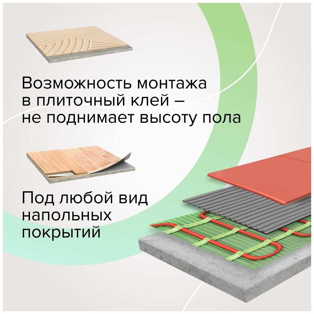 - Предназначен для монтажа в тёплую стяжку, плиточный клей или наливной пол