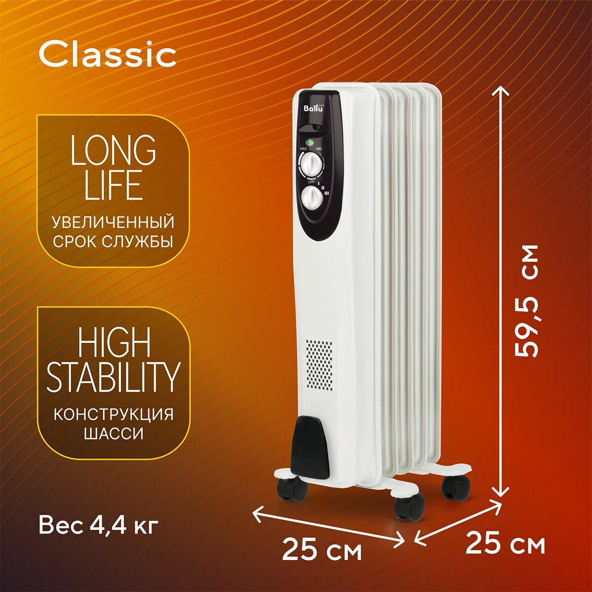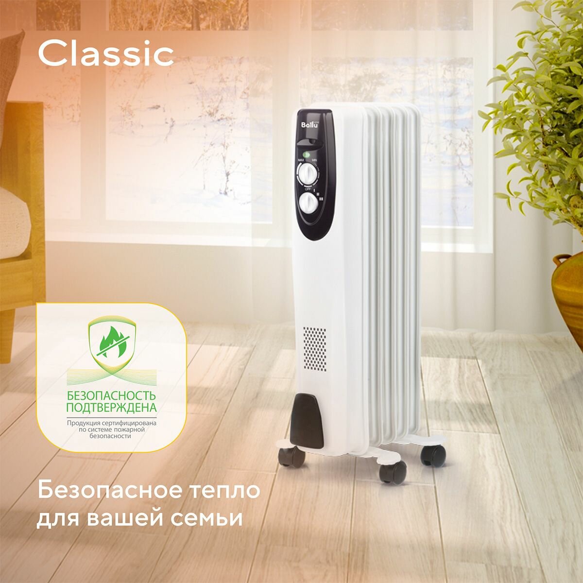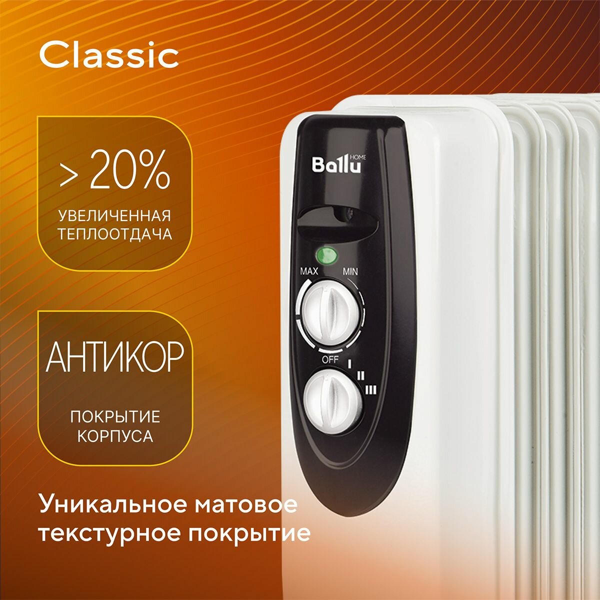 Масляный радиатор BALLU 1000 Вт ручка для переноски белый Classic BOH/CL-05WRN