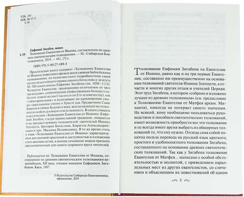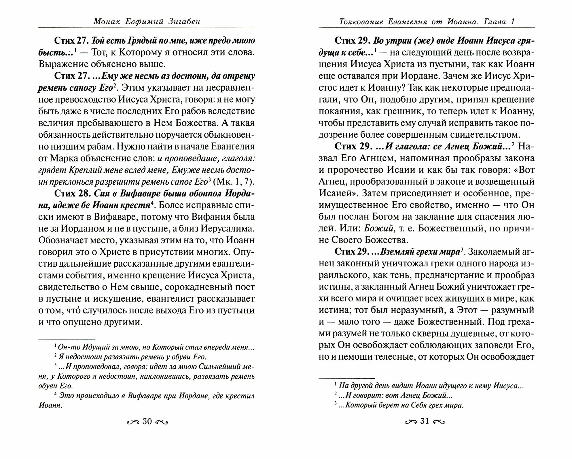 Предлагаемая книга содержит "Толкование Евангелия от Иоанна" известного прежде всего своими библейскими толкованиями, но малоизвестного подробностями своей жизни византийского православного богослова и экзегета XI-XII веков монаха Евфимия Зигабена (ок. 1050-1112). Четвертое Евангелие, традиционно отличаемое от трех предыдущих, синоптических (повествующих больше о событиях земной жизни Спасителя по Его человечеству), как "тайнозрительное" и излагающее по вдохновению свыше таинственное учение о Христе как Предвечном Сыне Божием и тайнах Будущего века, всегда налагало на толкователя особую духовную ответственность. В своем ставшем классическим "Толковании Евангелия от Иоанна" Евфимий Зигабен, следуя православной традиции, опирается и на предшествующих толкователей: святителей Иоанна Златоуста, Григория Богослова, Кирилла Александрийского и прп. Маскима Исповедника. В то же время стиль и язык "Толкования Евангелия от Иоанна" характеризуется достаточной простотой и доступностью в изложении столь высоких истин, и потому сочинение можно признать предназначенным для самого широкого круга читателей.