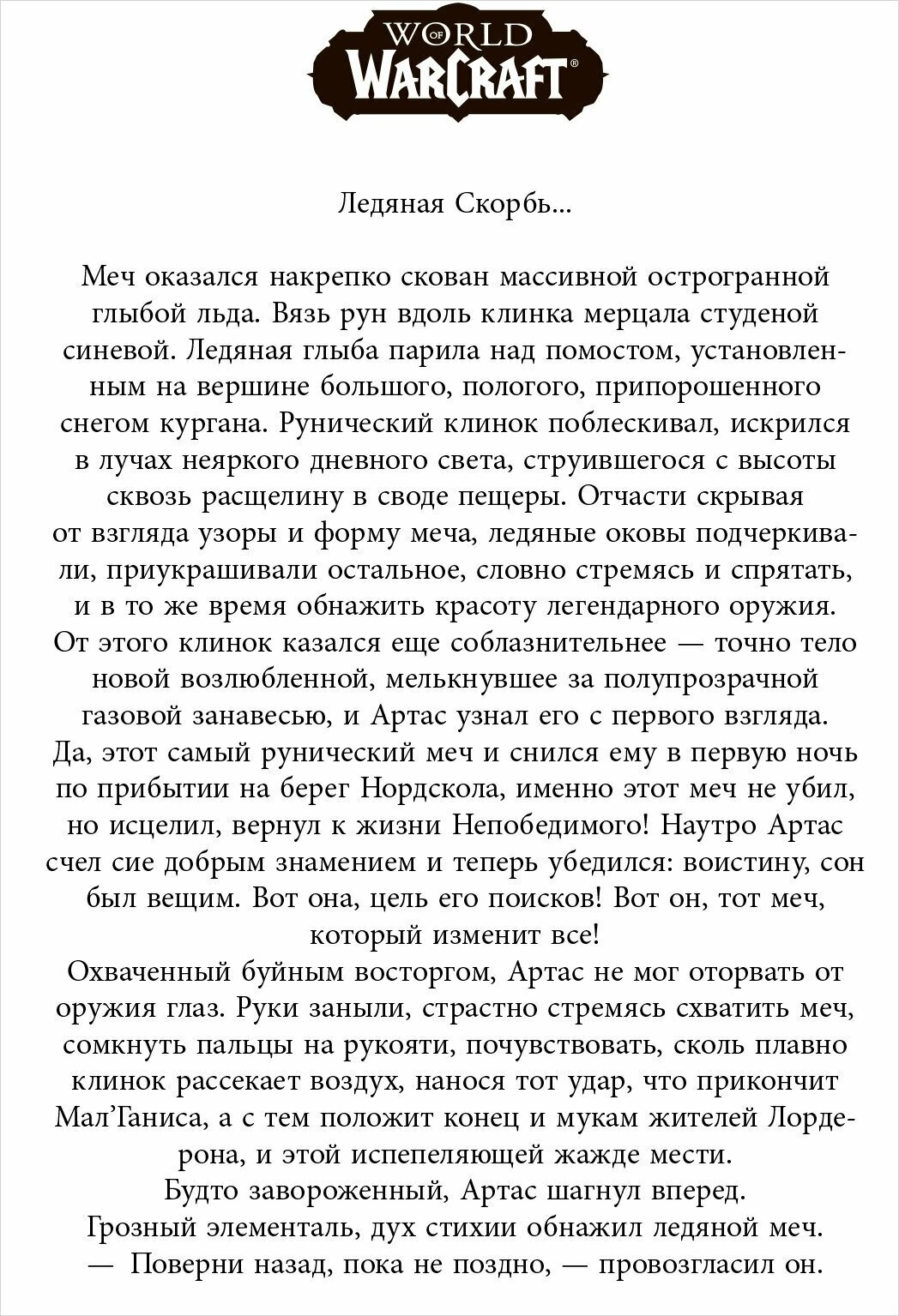 Когда на севере Лордерона разразилась чума, обращающая живых в нежить, несущая гибель всему, что он знал и любил, Артас устремляется на безнадежные поиски рунического клинка, наделенного силой, что способна спасти его родную страну. Однако предмет его поисков требует от нового хозяина невероятной жертвы. С его обретением для Артаса начинается ужасное нисхождение в бездну проклятия. Теперь путь лордеронского принца ведет в морозные северные пустоши к Ледяному Трону, - и навстречу мрачнейшей участи на свете.