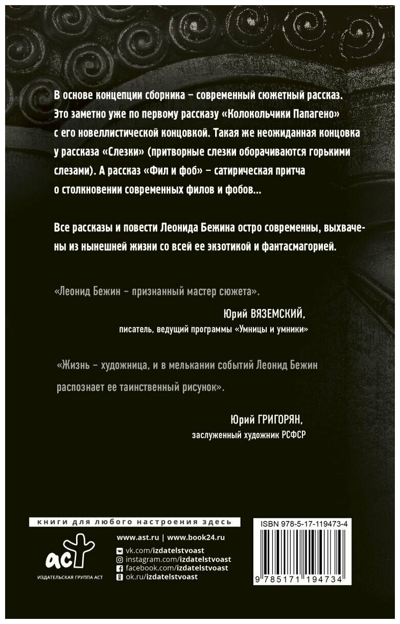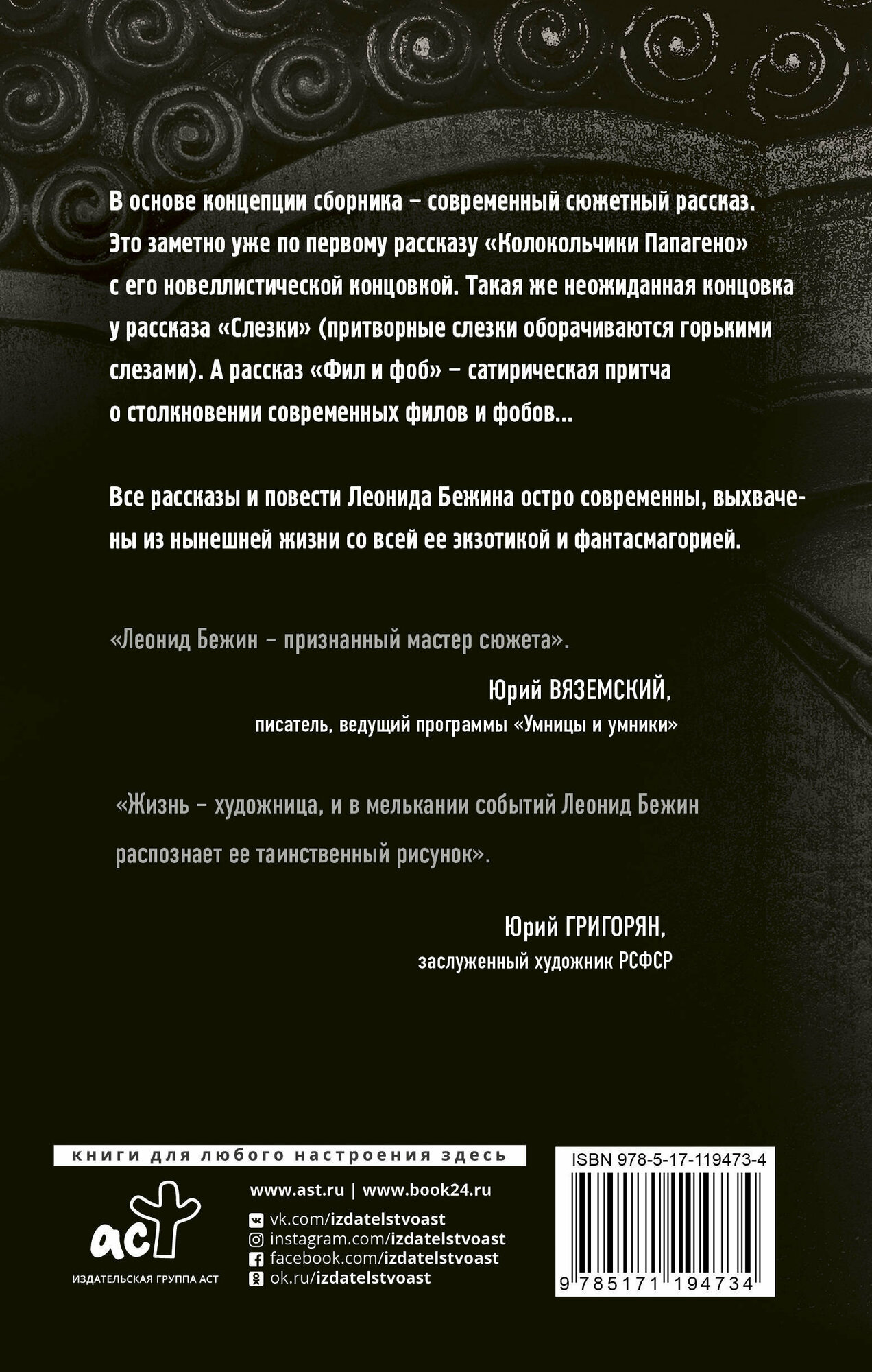 Все рассказы и повести Леонида Бежина остро современны, выхвачены из нынешней жизни со всей ее экзотикой и фантасмагорией. В основе концепции сборника - современный сюжетный рассказ. Это заметно уже по первому рассказу "Колокольчики Папагено" с его новеллистической концовкой. Такая же неожиданная концовка у рассказов "Слезки" (притворные слезки оборачиваются горькими слезами). А рассказ "Фил и фоб" - сатирическая притча о столкновении современных филов и фобов…