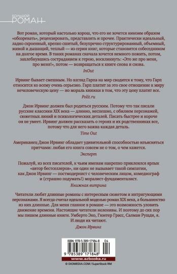 Честно сказать, мне трудно быть объективной, так как Джон Ирвинг мой любимый автор. Его истории прекрасны, а в совокупности с его стилем — мрачная ирония, - читать автора сплошное наслаждение. -