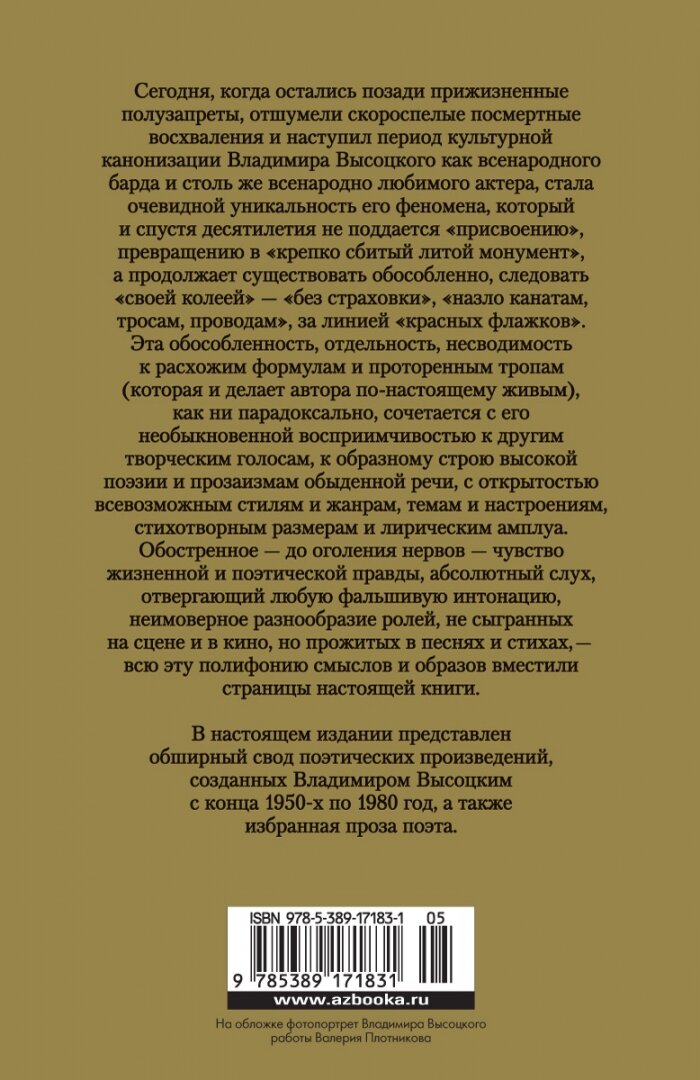 В настоящем издании представлен обширный свод поэтических произведений, созданных Владимиром Высоцким с конца 1950-х по 1980 год, а также избранная проза поэта.