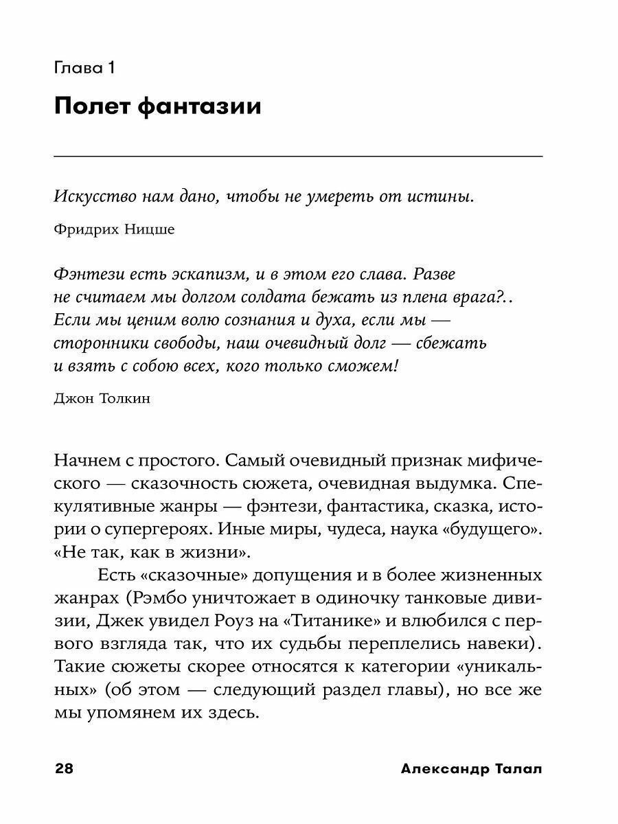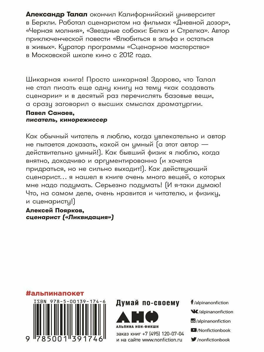 Разве в жизни так бывает? В жизни бывает и не такое! Чем отличается художественная правда от реальности и где лежит грань между ними? Почему полностью выдуманная драматическая история часто кажется нам более правдивой, чем сама жизнь? Этой теме посвящает свою книгу известный сценарист, преподаватель сценарного мастерства Александр Талал. Анализируя феномен мифологического восприятия, автор знакомит читателя с техниками, которыми пользуются создатели захватывающих историй, сочетая и смешивая мифические и жизненные элементы, «правду» и «ложь». На примере известных кинофильмов и сериалов он показывает, как эти приемы воздействуют на аудиторию и помогают добиться зрительского успеха.