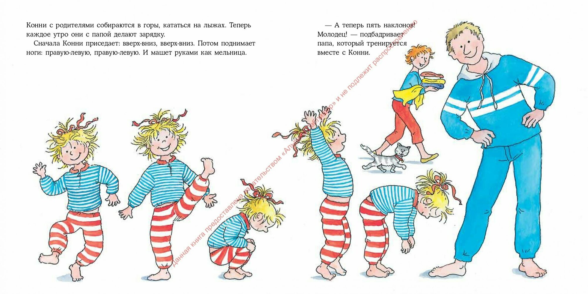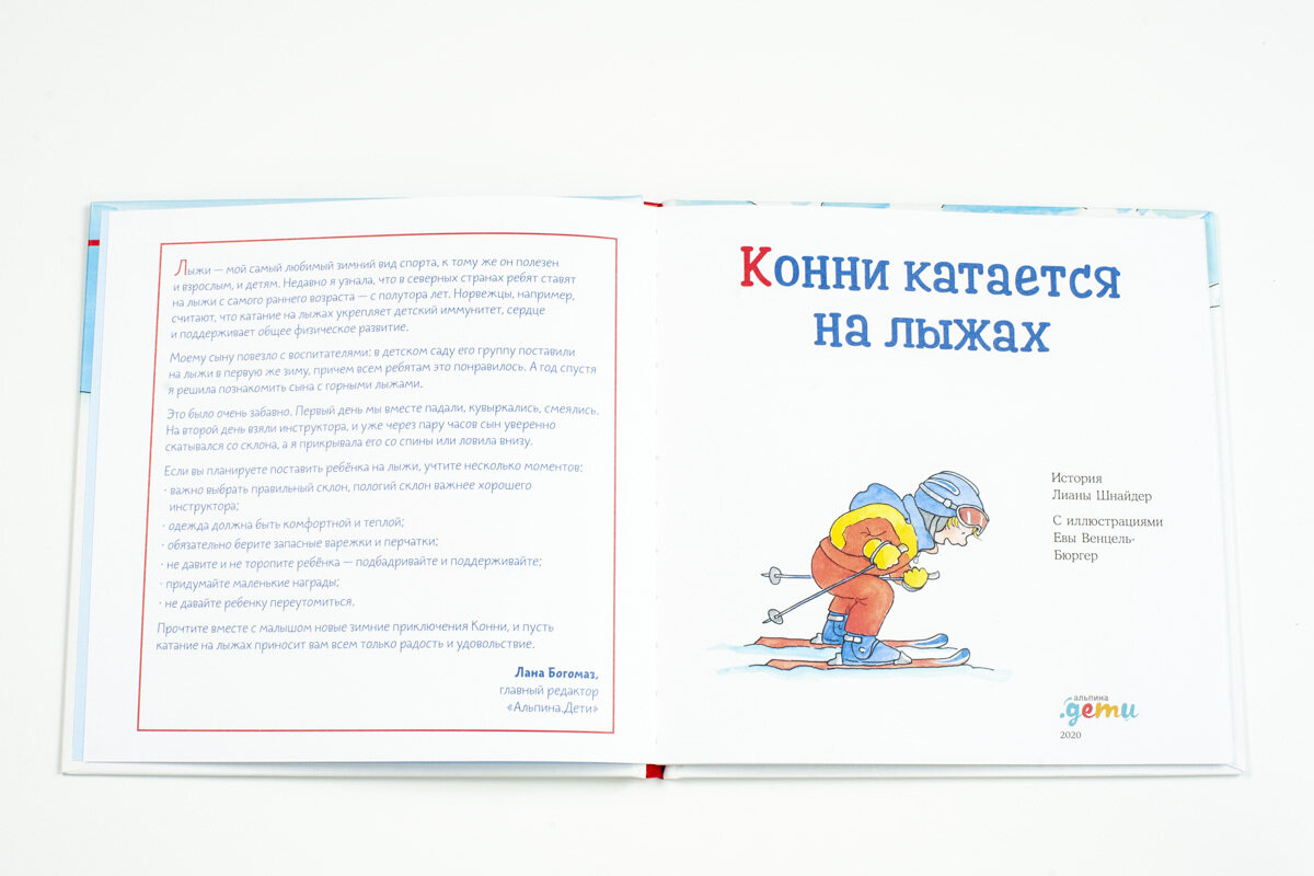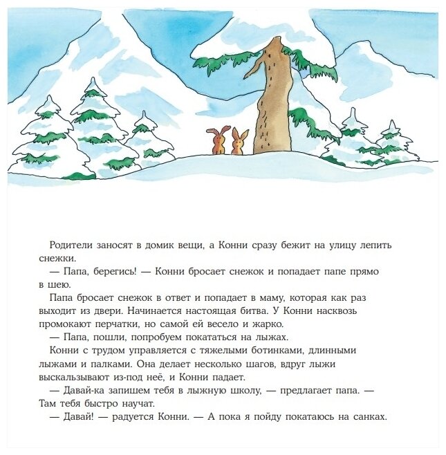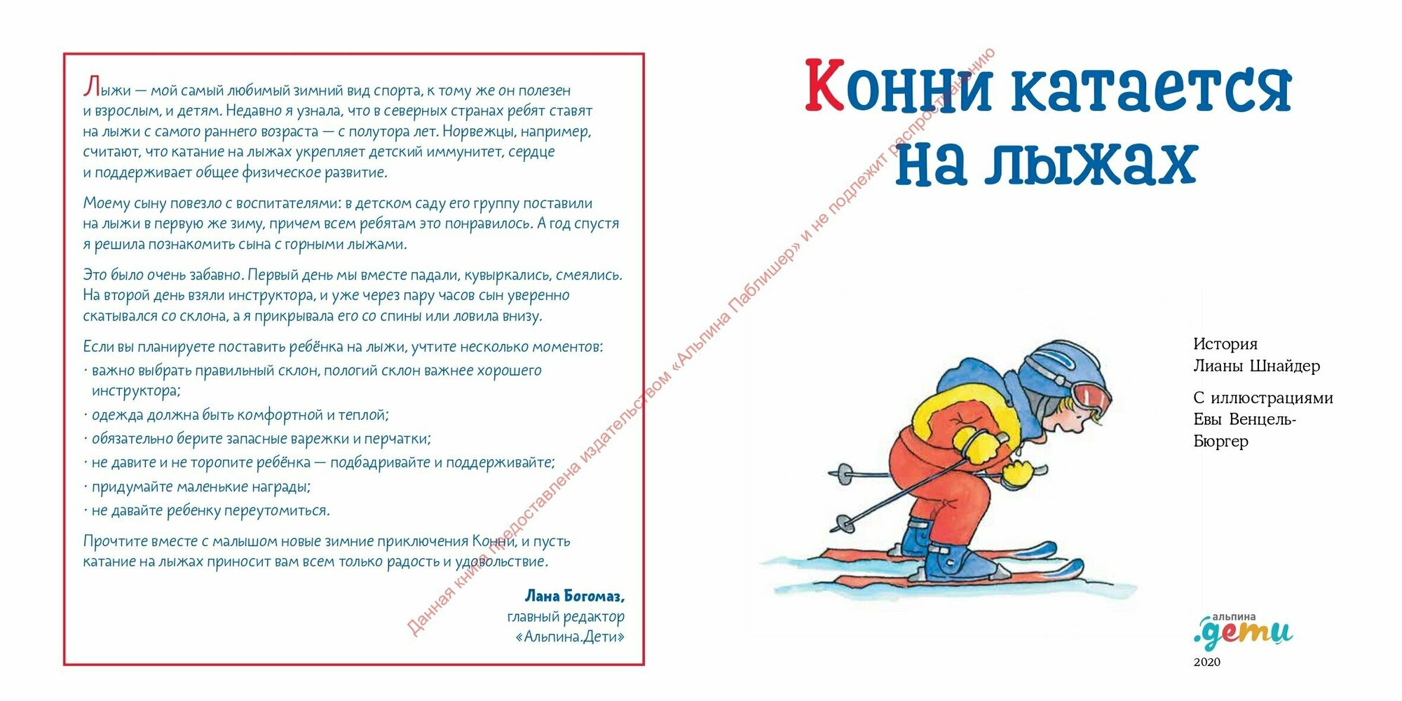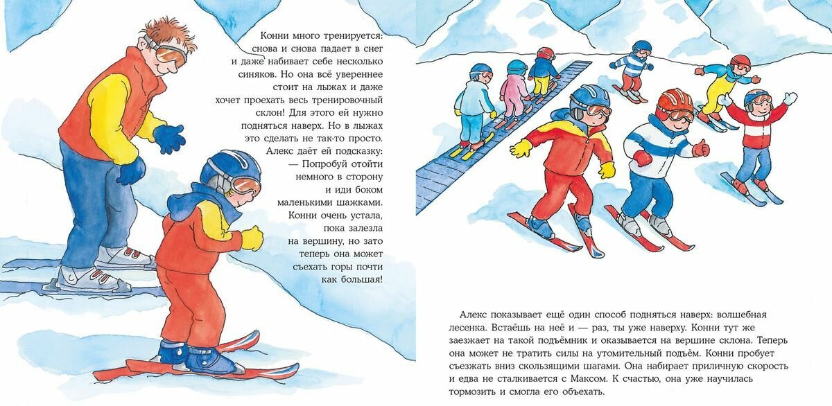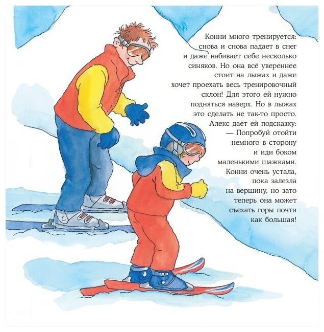 Вы уже прочитали книгу? Тогда закройте ее и предложите малышу вспомнить, о чем была эта история. С кем Конни отправилась в горы кататься на лыжах? У нее сразу всё получилось или пришлось потренироваться? У Конни появились новые друзья на каникулах?