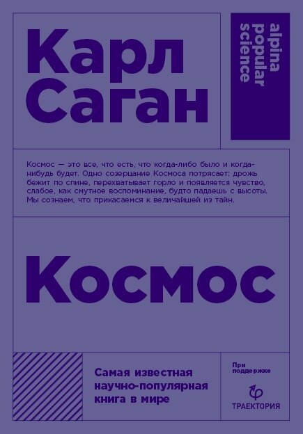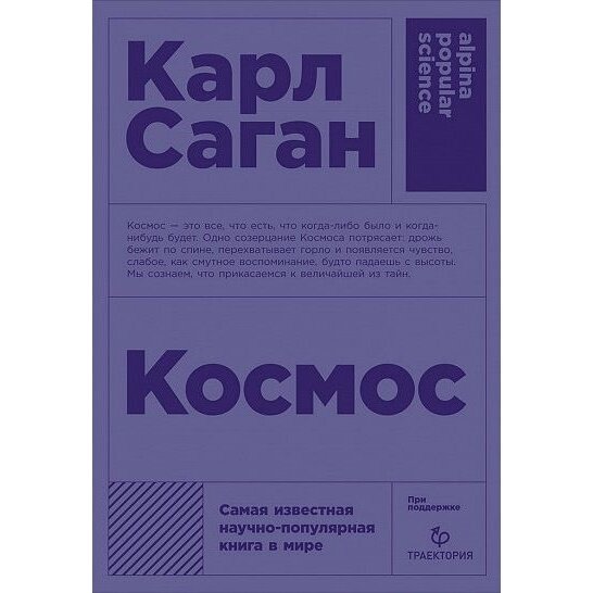 «Космос» — одна из самых продаваемых научно-популярных книг всех времен. В ней прослеживается почти четырнадцать миллиардов лет космической эволюции, превративших материю в сознание, и исследуются такие темы, как происхождение жизни, человеческий мозг, египетские иероглифы, миссии космических кораблей, смерть Солнца, эволюция галактик, а также обстоятельства и личности, которые помогли сформировать современную науку.