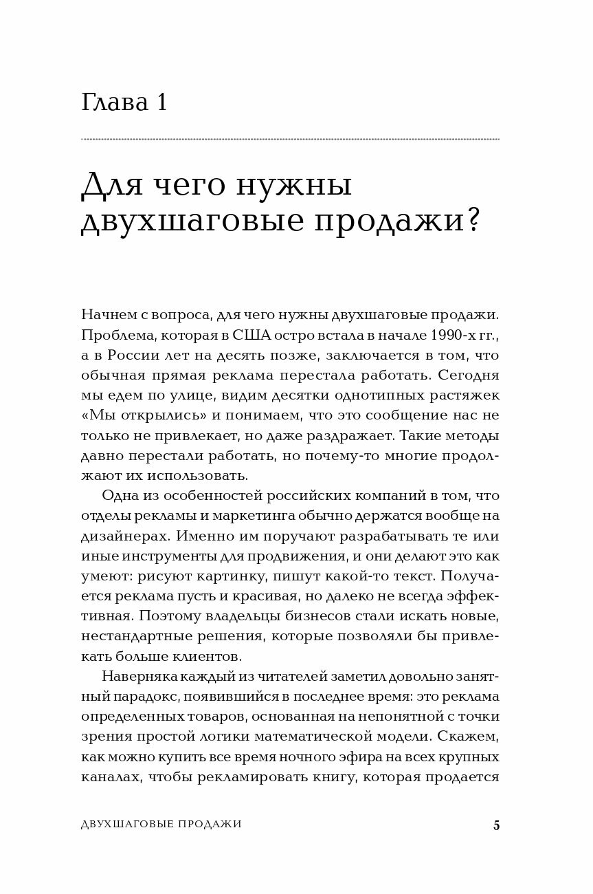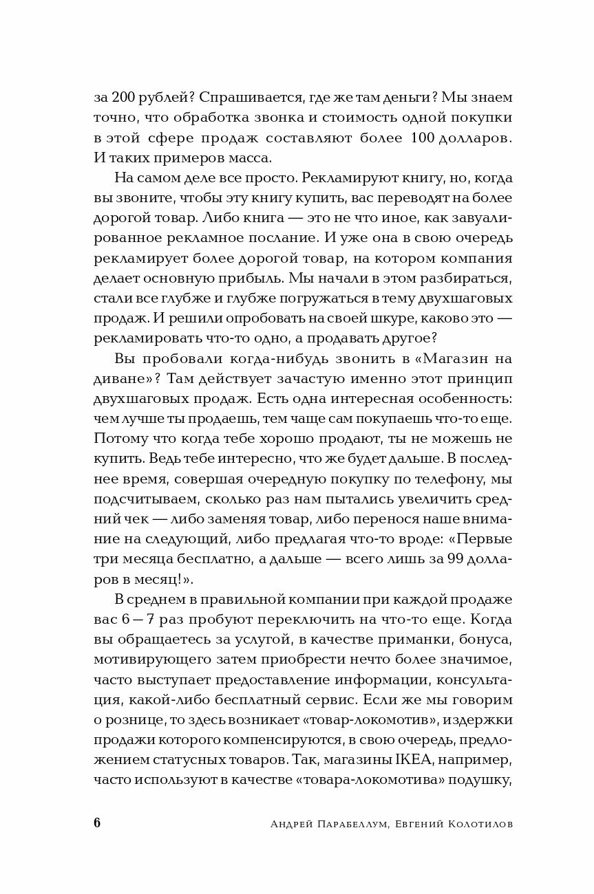 Продажи, организация системы продаж - основа бизнеса. C каждым годом обеспечивать рост продаж или даже поддерживать их на текущем уровне становится все сложнее. Конкуренция нарастает, экономическая ситуация усложняется, аудитория пресыщена и все более разборчива. Да, методик продвижения продуктов и услуг очень много, но большинство из них либо устарели, либо не работают в России. Книга Андрея Парабеллума и Евгения Колотилова, ведущих российских специалистов в области продаж, дает конкретную и четкую методику, которая позволяет повысить продажи практически в любом бизнесе. Методика "двухшаговых продаж" позволяет эффективно привлекать целевую аудиторию и надежно удерживать ее. Авторы фокусируются на практических рекомендациях: как работать с товарной матрицей, вводя товары-локомотивы, маячковые и статусные товары, как заинтересовать клиента, как увеличивать интернет-продажи. Книга адресована руководителям компаний, менеджерам по продажам и всем, кто интересуется механизмами продвижения товаров и услуг на российском рынке.