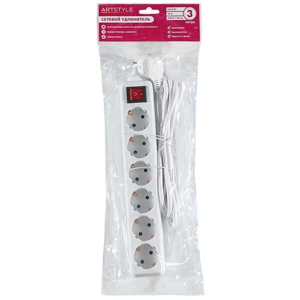 Удлинитель Artstyle CL-C63GSW – это надежное и удобное решение для подключения различных электроприборов. Модель оснащена шестью розетками типа F (евророзетка), что позволяет одновременно подключать несколько устройств. Длина кабеля составляет 3 метра, что обеспечивает достаточную свободу передвижения.