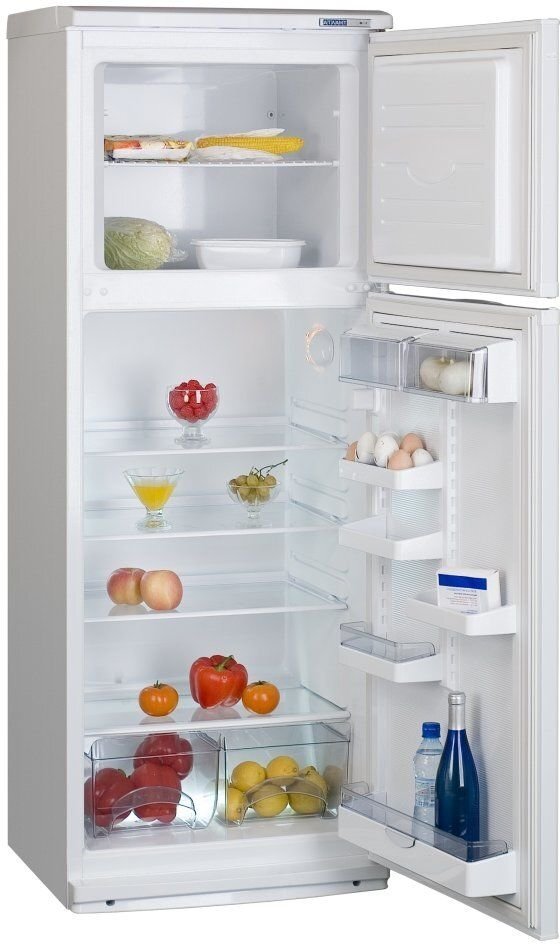 Атлант - это двухкамерный холодильник с морозильной камерой в верхней части, который отличается впечатляющей вместимостью в 280 л. Управление электромеханическое, разморозка морозильной камеры ручная, а холодильной камеры - капельная система.