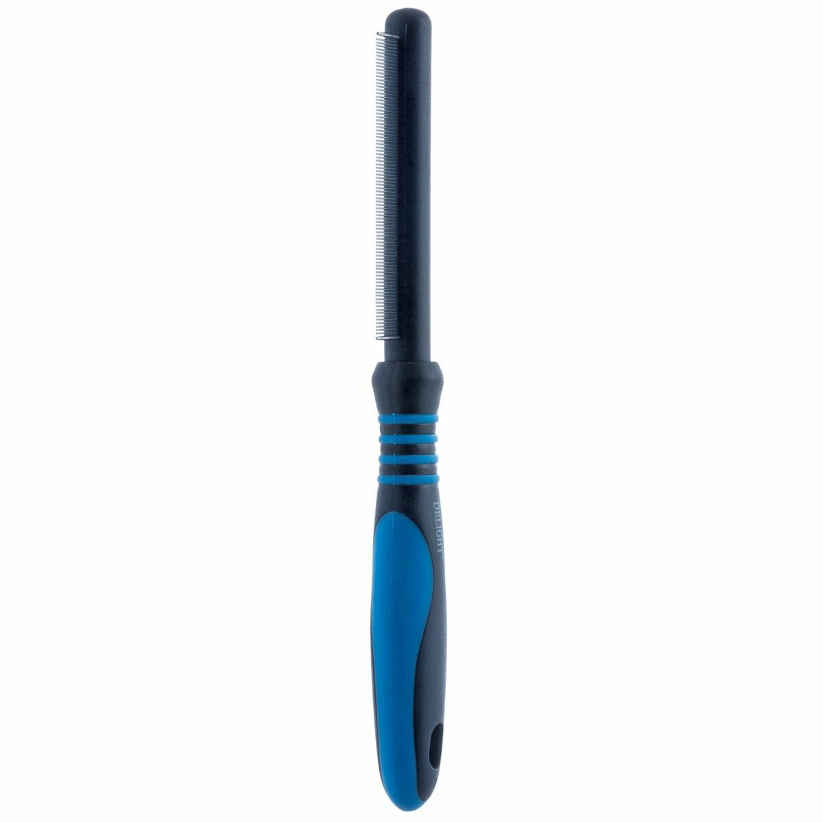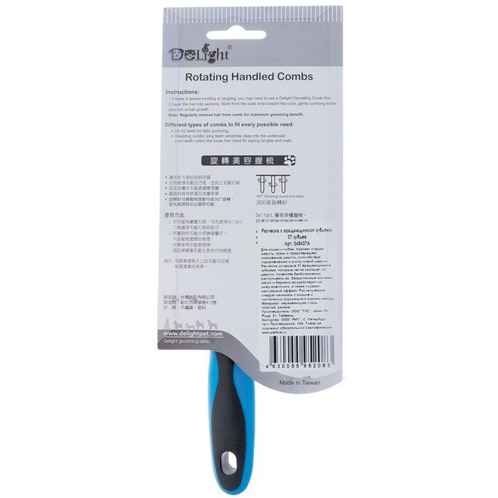 Расчёска DeLIGHT предназначена для кошек и собак. Удаляет старую шерсть, грязь и предотвращает скатывание шерсти, способствуя оздоровлению и росту новой шерсти. Расчёска оснащена 37 вращающимися зубьями, которые легче скользят по шерсти, позволяя безболезненно распутывать ее. Закругленные кончики мягко и бережно воздействуют на кожу животного, а также создают массажный эффект. Расчесывание следует начинать с концов и постепенно опускаться к корням шерсти. Длина ручки 121 мм. Зубья 37. Длина зуба 18 мм. Диаметр зуба 1.4 мм. Инструменты для груминга DeLIGHT - превращаем заботу в удовольствие!