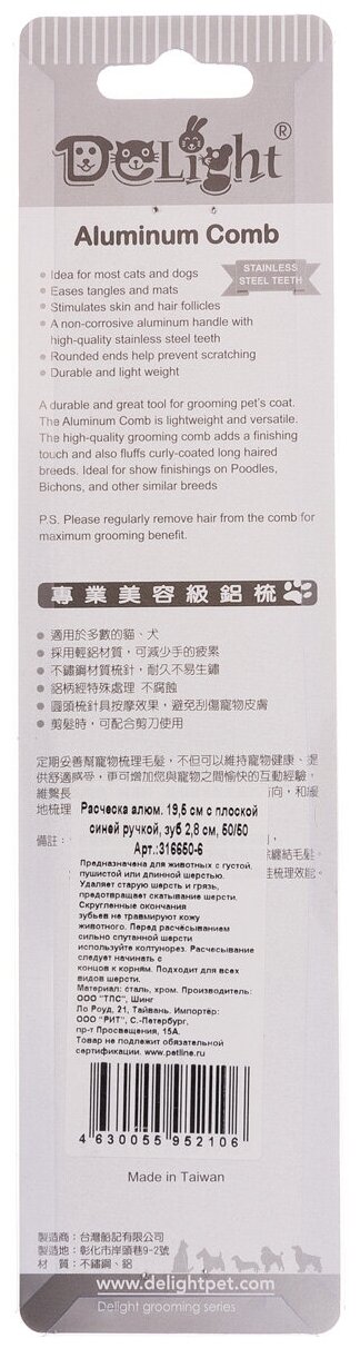 На сегодняшний день товар «Расчёска DeLIGHT алюм. 19,5 см с плоской синей ручкой, зуб 2,8 см, 50/50 316650-6» можно купить с кешбеком в 1 магазине: Яндекс.Маркет