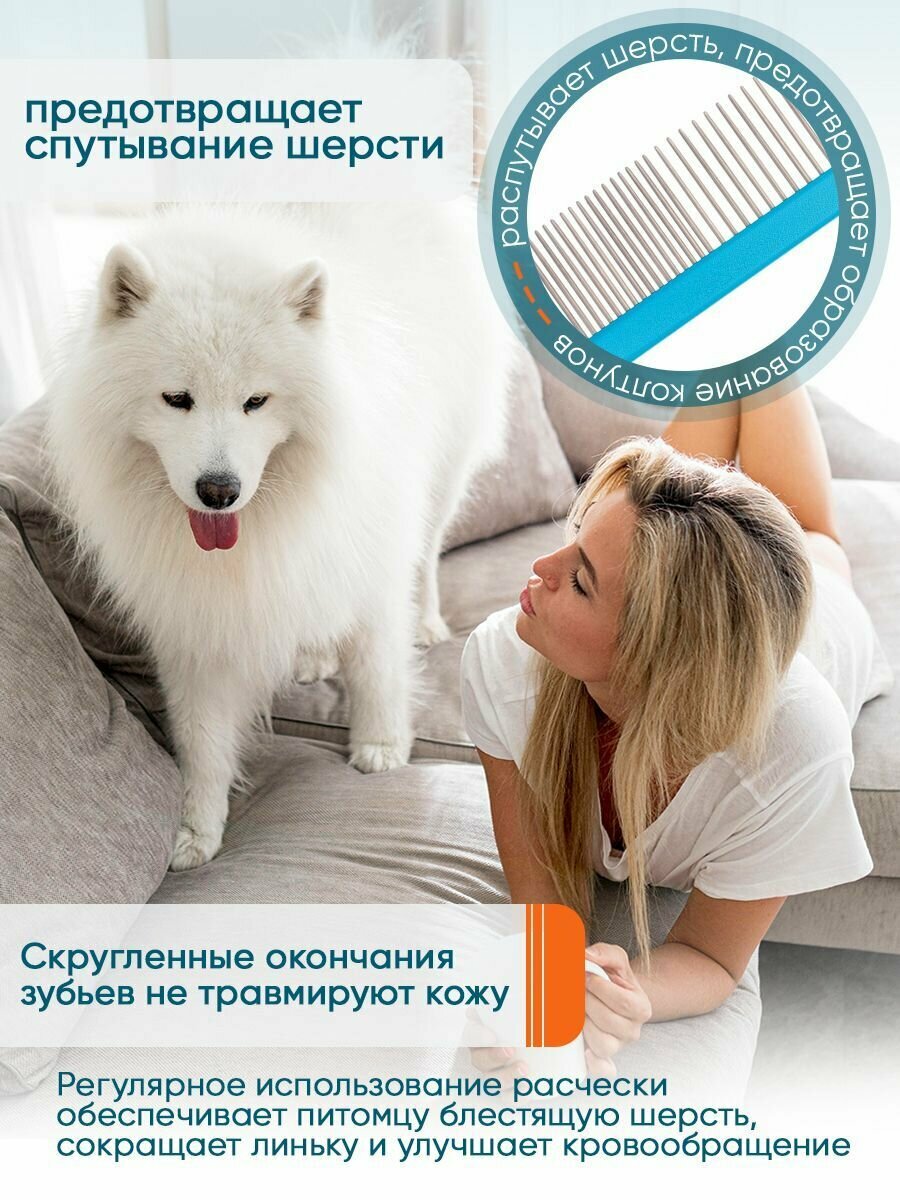 Предназначена для животных с густой, пушистой или длинной шерстью. Удаляет старую шерсть и грязь, предотвращает скатывание шерсти. Скругленные окончания зубьев не травмируют кожу животного. Перед расчёсыванием сильно спутанной шерсти используйте колтунорез. Расчесывание следует начинать с концов к корням. Подходит для всех видов шерсти. Материал: сталь хромированная, аллюминий.