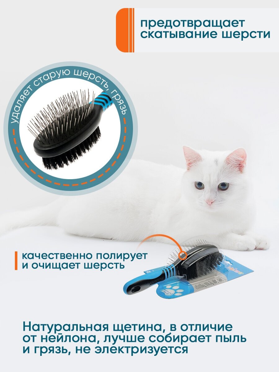 Обладает высочайшим качеством за счет использования в производстве натуральной щетины кабана, которая прекрасно очищает шерсть, придавая ей здоровый и естественный блеск.Придает шерсти здоровый и пушистый вид, удаляет старую шерсть и грязь.Инструкция:Если шерсть животного спутана, используйте сначала расческу с вращающимися зубьями.Используйте специальные щетки "еж", для придания шерсти здорового и пушистого видаИспользуйте специальные щетки и пуходерки для расчесывания шерсти вокруг глаз, лап.Рекомендованно для йоркширских терьеров.Материал: пластик, резина, натуральная щетина.Длина ручки 112 мм.Рабочая область 100х56 мм.Высота щетины 20 мм.Длина зуба 22 мм.Диаметр зуба 0.75 мм.
