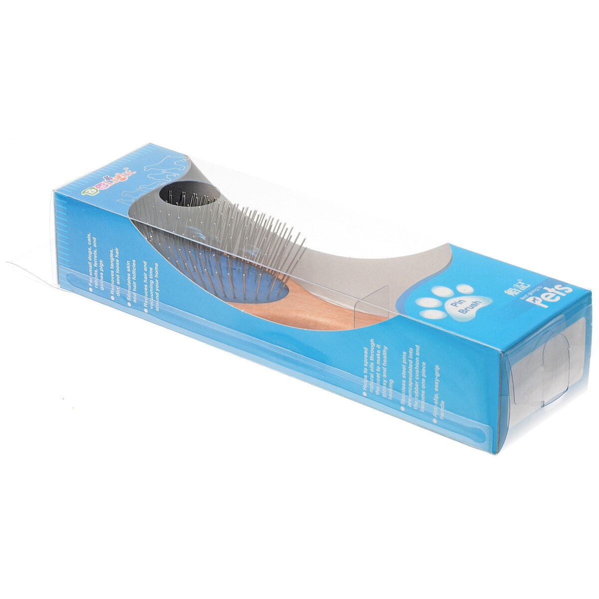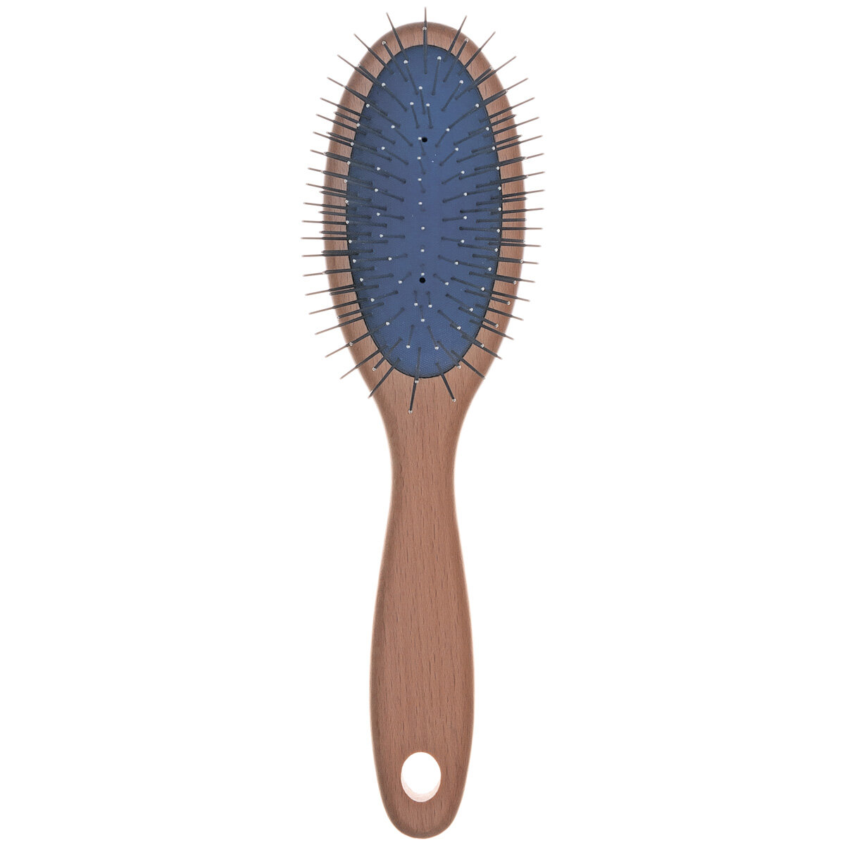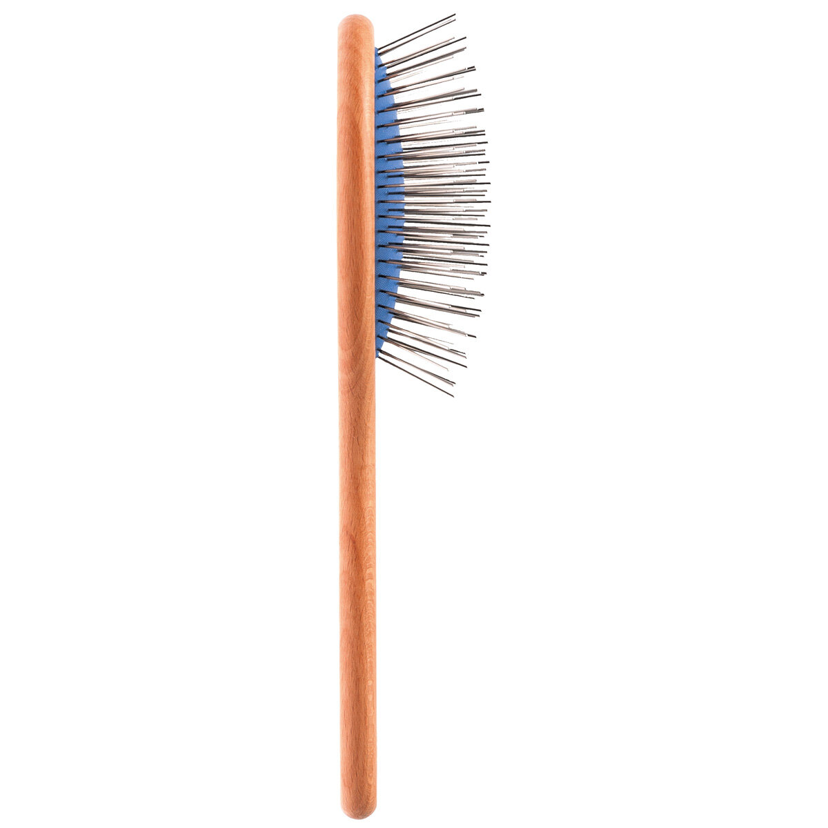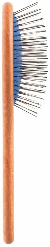 Деревянная ручка из бука удобна в использовании - ультралегкая и не скользит в руке. Запатентованная система крепления зубьев, не позволяет зубьям вдавливаться внутрь и выпадать, что способствует более качественному расчесыванию и продлевает срок службы щетки. Скругленные кончики зубьев делают щетку безопасной для питомца. За счет длины зубьев при расчесывании шерсть животного хорошо просушивается, и ей придается объем.Длина ручки 105 мм. Рабочая область 100х51 мм. Длина зуба 22 мм. Диаметр зуба 0.75 мм.Материал: нерж. сталь, пластик, бук.