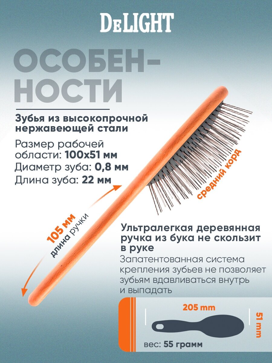 Деревянная ручка из бука удобна в использовании - ультралегкая и не скользит в руке. Запатентованная система крепления зубьев, не позволяет зубьям вдавливаться внутрь и выпадать, что способствует более качественному расчесыванию и продлевает срок службы щетки. Скругленные кончики зубьев делают щетку безопасной для питомца. За счет длины зубьев при расчесывании шерсть животного хорошо просушивается, и ей придается объем.Длина ручки 105 мм. Рабочая область 100х51 мм. Длина зуба 22 мм. Диаметр зуба 0.75 мм.Материал: нержавеющая сталь, пластик, бук.