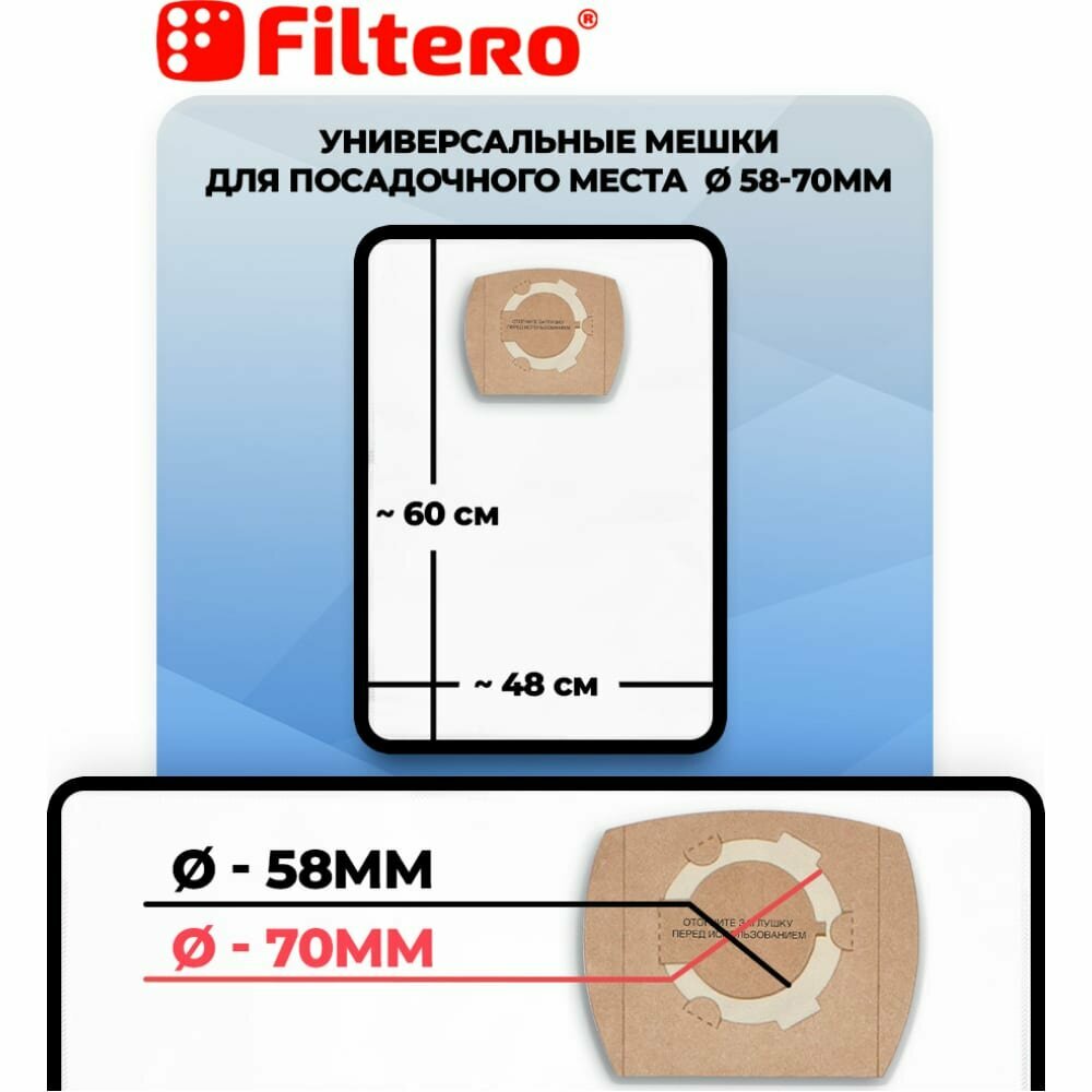 Мешки Filtero UN 20 Pro, имеющие универсальный фланец посадочное место с диаметром отверстия эластичного уплотнителя от 44-70 мм 58-70 мм по картону , пригодны для установки в любые промышленные пылесосы до 25 л, конструкция которых допускает использование одноразовых мешков.