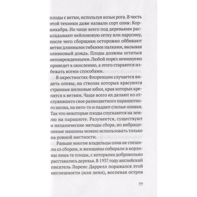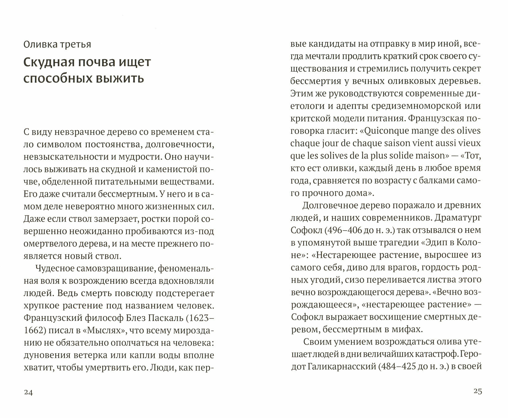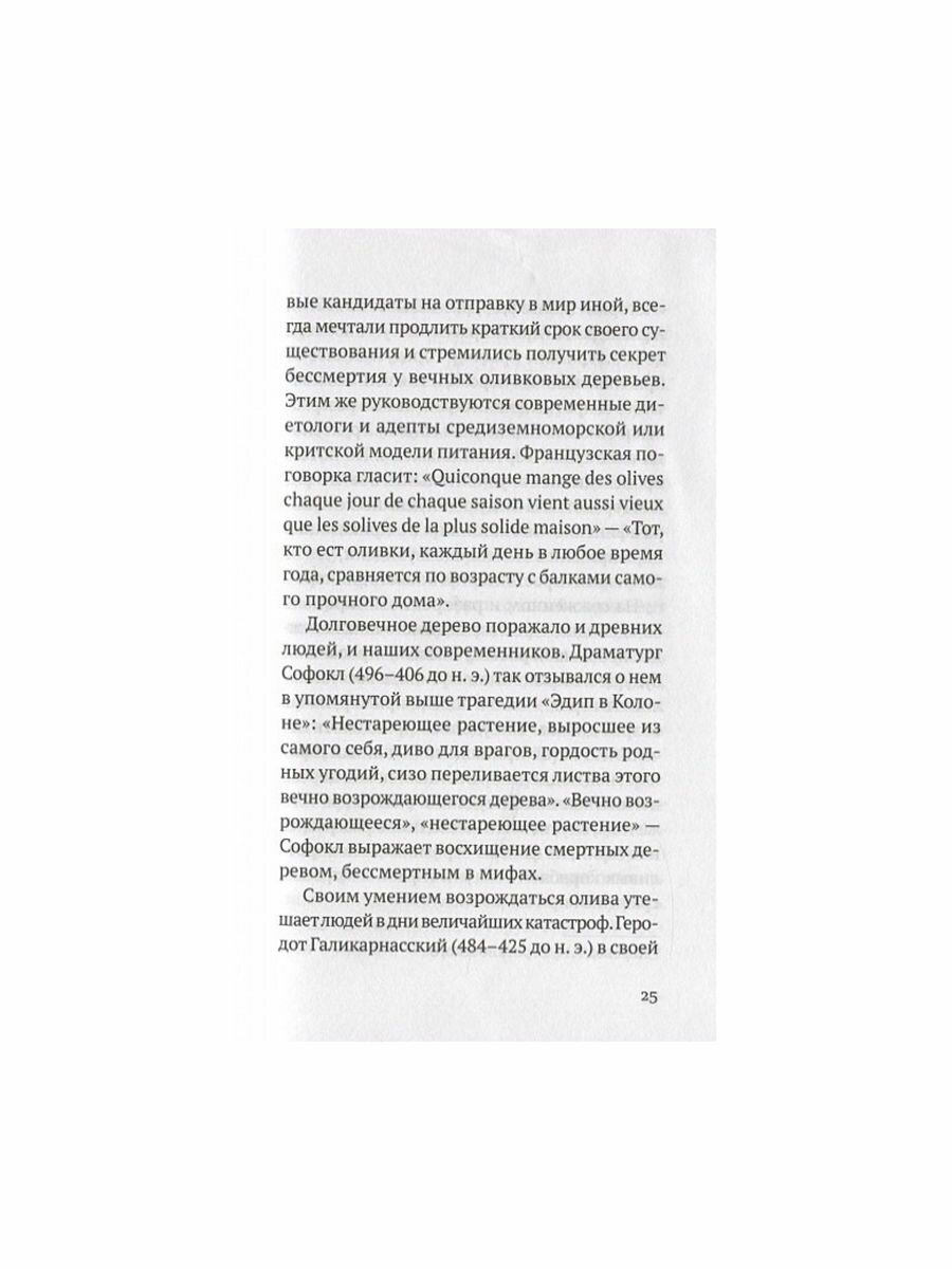 Автор пишет об оливах с благоговением. Это читается в каждой строке. Простое дерево Средиземноморья открывается читателю с таких разных сторон, что ждёшь с нетерпением следующую главу. Тут и мифология, и ботаника, и живопись, и стихи, и даже химия производства масла и консервированных оливок. Читаешь эту книгу также неспешно, как растёт и зреет олива.