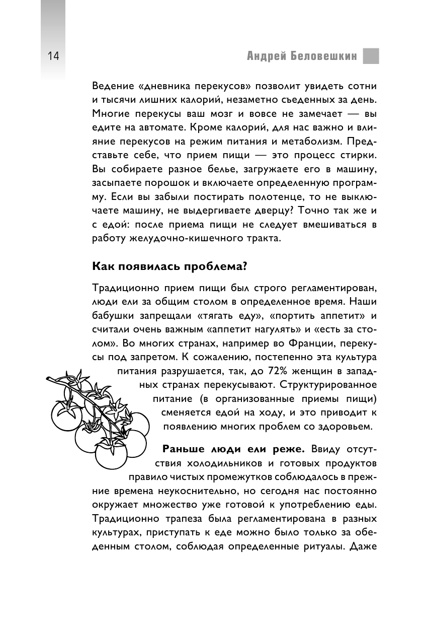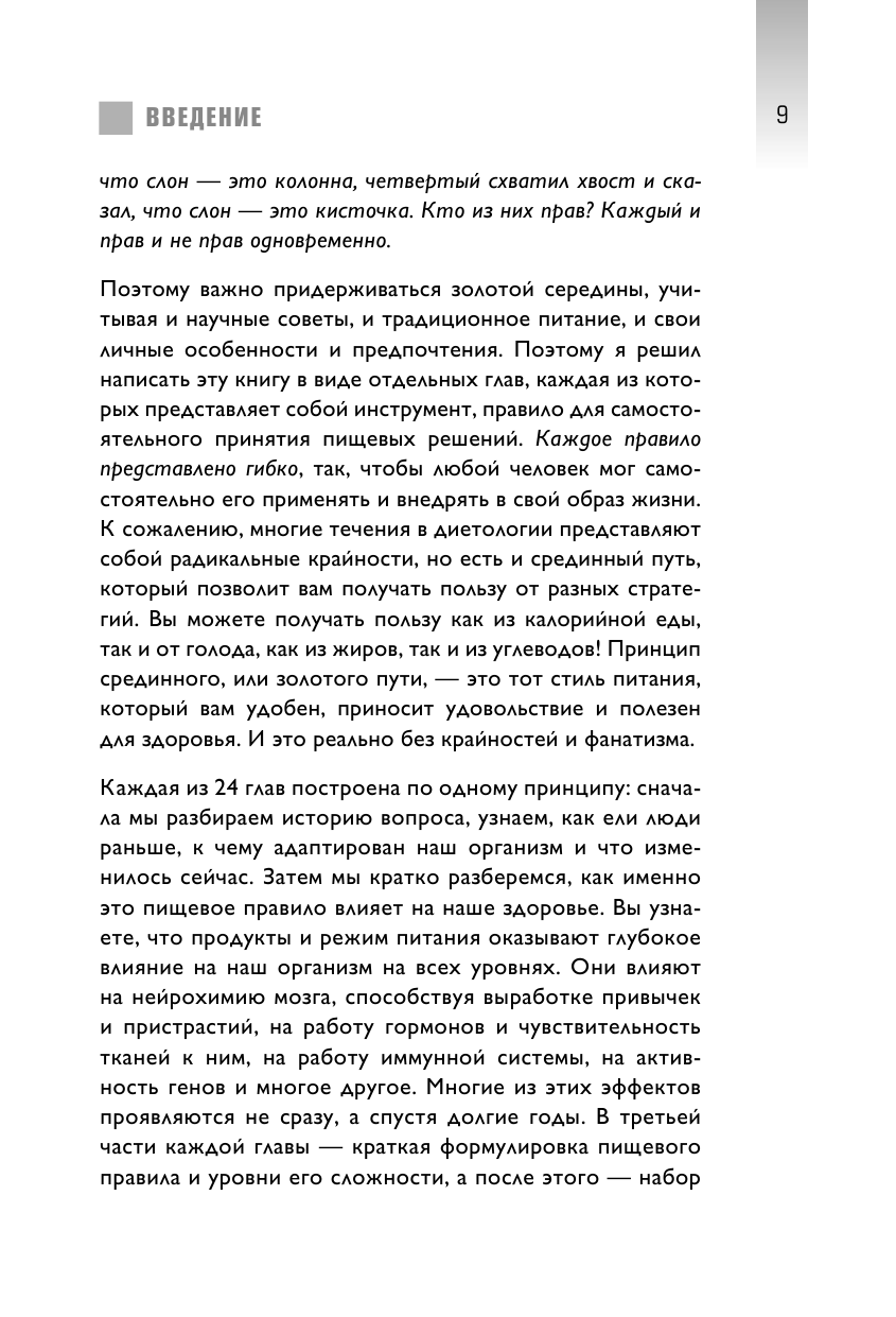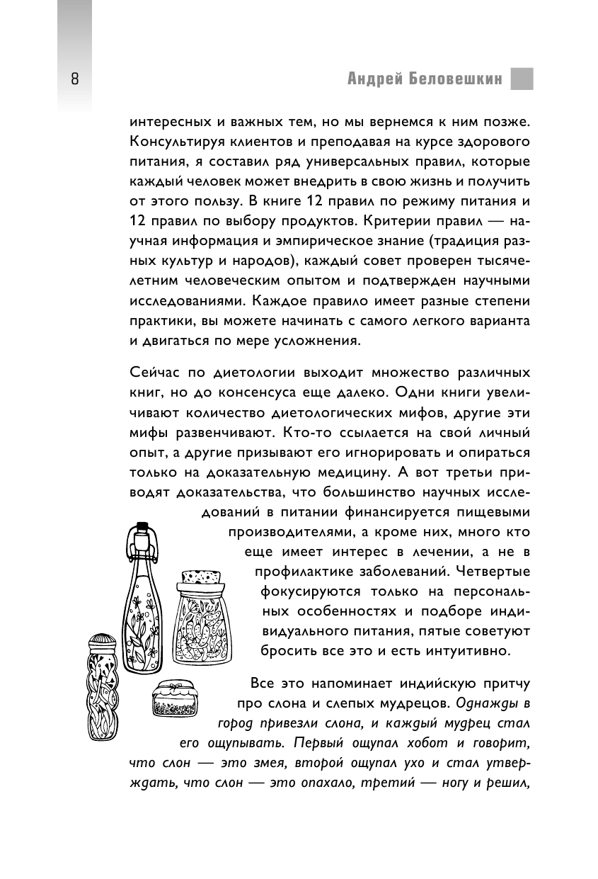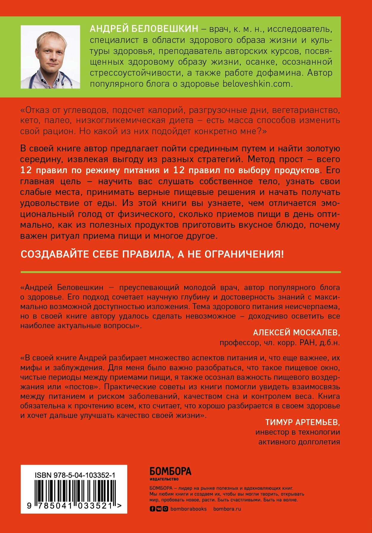 Книга Андрея Беловешкина, врача, к. м. н., преподавателя, — это свод гибких правил, каждое из которых можно применять отдельно. Правила режима питания, выбора продуктов, а также психологии питания дают ответы на самые важные вопросы — когда есть? что есть? и как есть?