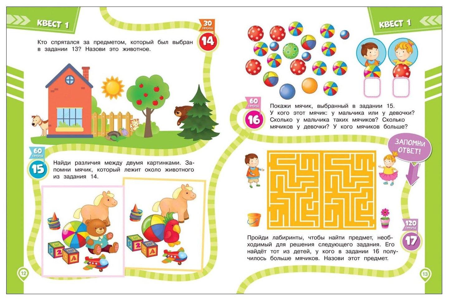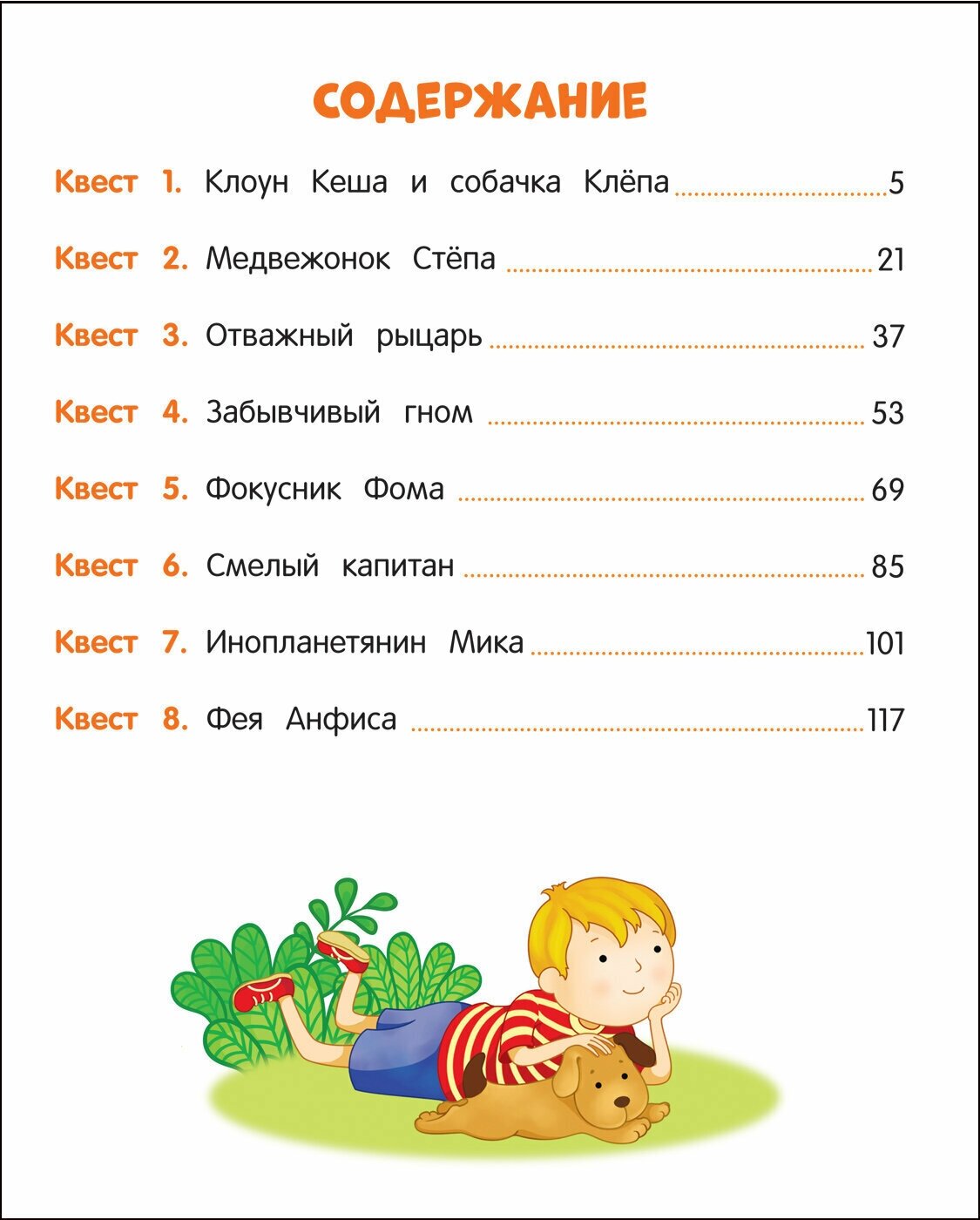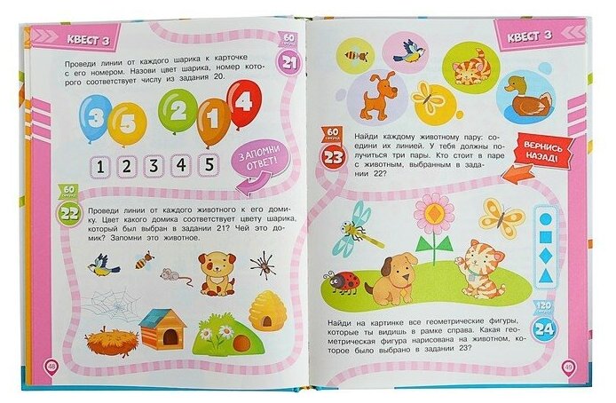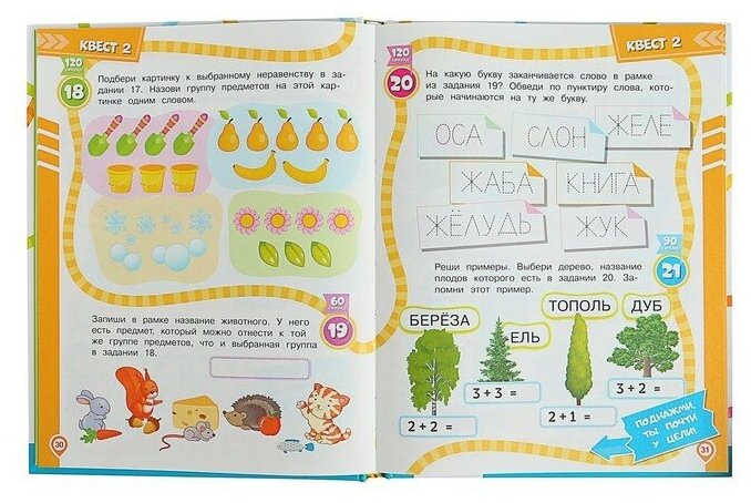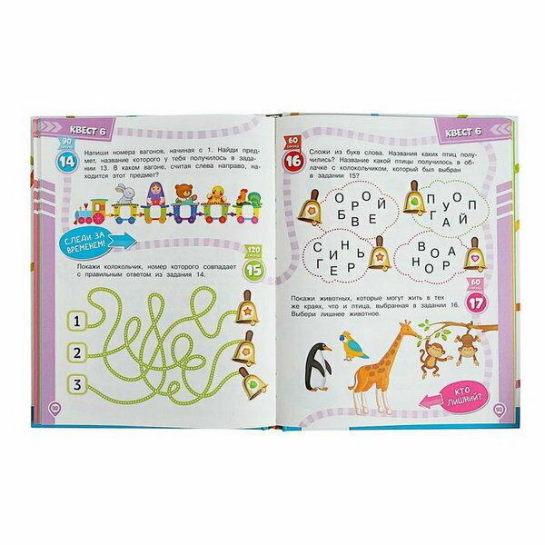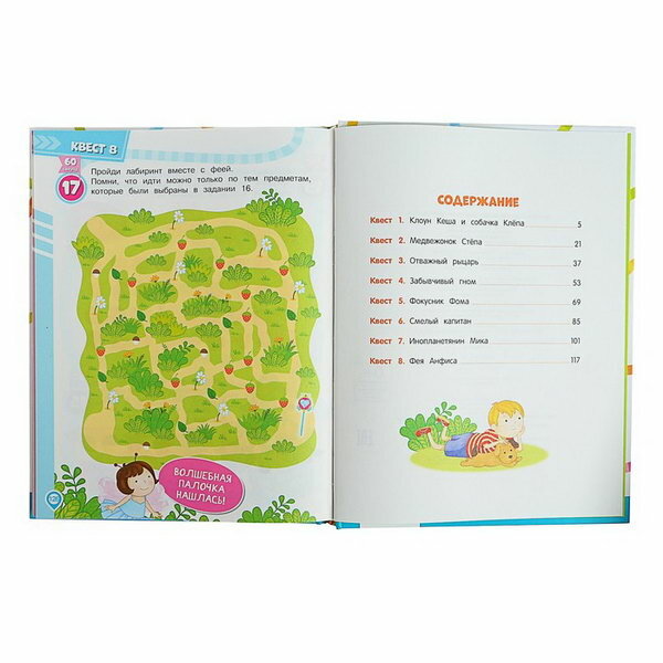 Книга состоит из 8 квестов. Каждый квест — законченная история со своими героями, которым нужно помочь что-то найти, куда-то добраться и т. д. Задания охватывают всю тематику дошкольной подготовки (математика, грамота, окружающий мир, логика и т.д.).