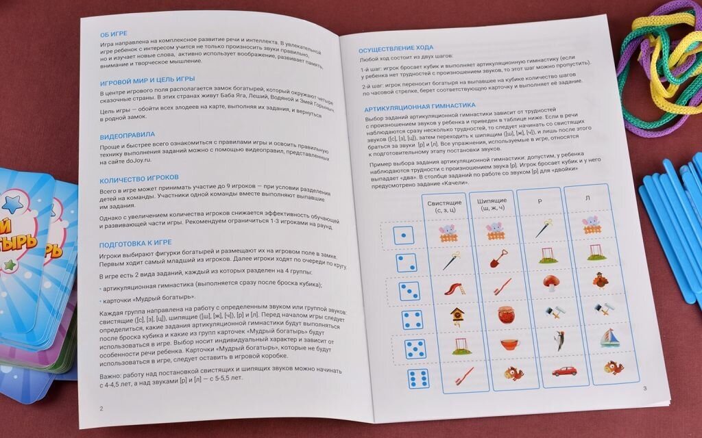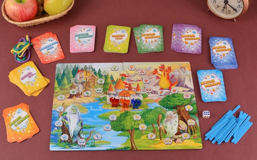 | Состав набора | игровое поле, 3 игровые фигурки богатырей,120 карточек с заданиями, 30 счетных палочек, шнурки, 2 пакетика для карточек, игровой кубик |