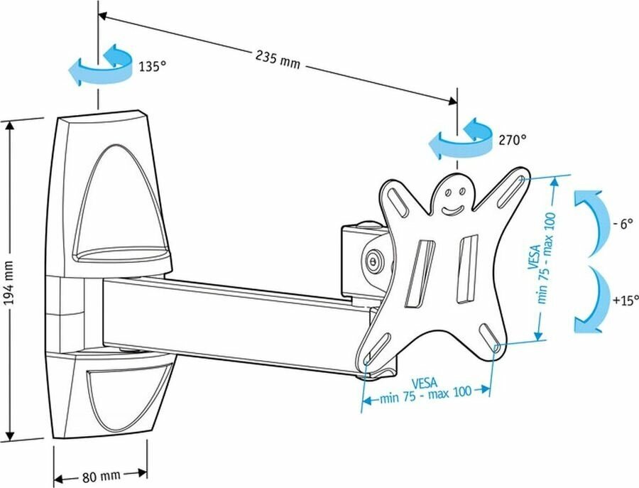 | Особенности | расстояние от стены 80-235 мм, угол наклона -6°+15°, угол поворота 270° |
