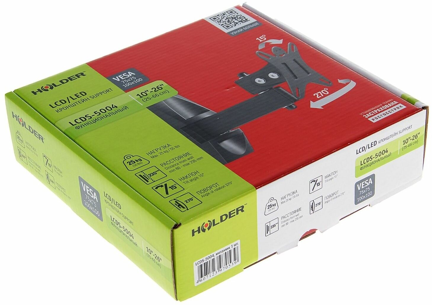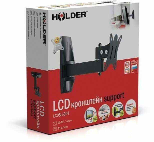 В процессе покупки хорошего ТВ возникает логичный вопрос, а куда же его поставить? И ведь задаваться им совершенно не обязательно, если у вас есть кронштейн производства компании Holder модели , ведь теперь вы можете попросту повесить телевизор на стену. Это значительно удобнее стандартной модели использования, а так же гарантирует устойчивость конструкции в целом. Он соответствует классу настенно-наклонно-поворотных, что гарантирует точную отстройку позиции изображения относительно конечно пользователя и обеспечит прекрасный юзер-экспириенс. Минимальная диагональ экрана составляет всего 10 дюймов, что отлично подходит для кухни, или сенсорных дисплеев в кафе и ресторанах. Максимальная же диагональ в 26 дюймов как бы намекает на то, что использовать данное устройство нужно в первую очередь в небольших комнатах, где не требуются большие диагонали. Это может быть кухня, или гостевая комната. По VESA данное устройство поддерживает форматы 75х75 и 100х100, как уже оговаривалось присутствует большое количество вариаций конечного положения готовой конструкции. Угол поворота составляет 270 градусов, чего достаточно для любых потребностей.