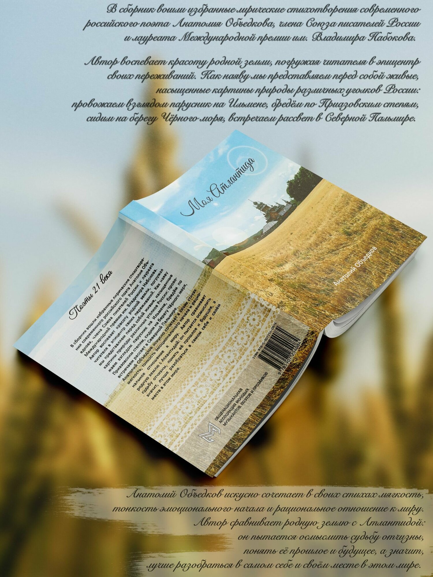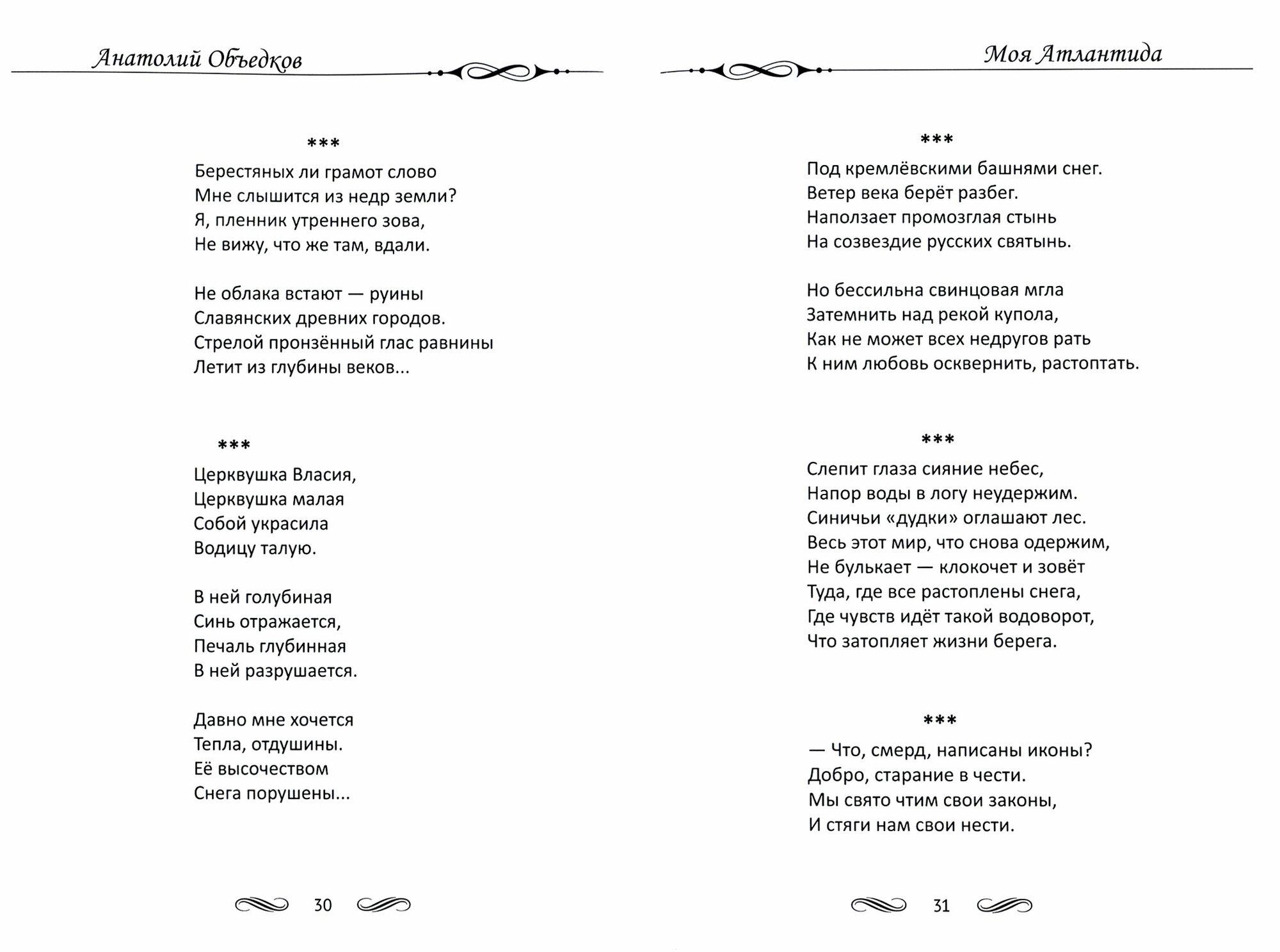 Анатолий Объедков искусно сочетает в своих стихах мягкость, тонкость эмоционального начала и рациональное отношение к миру. Автор сравнивает родную землю с Атлантидой: он пытается осмыслить судьбу отчизны, понять её прошлое и будущее, а значит, лучше разобраться в самом себе и своём месте в этом мире.