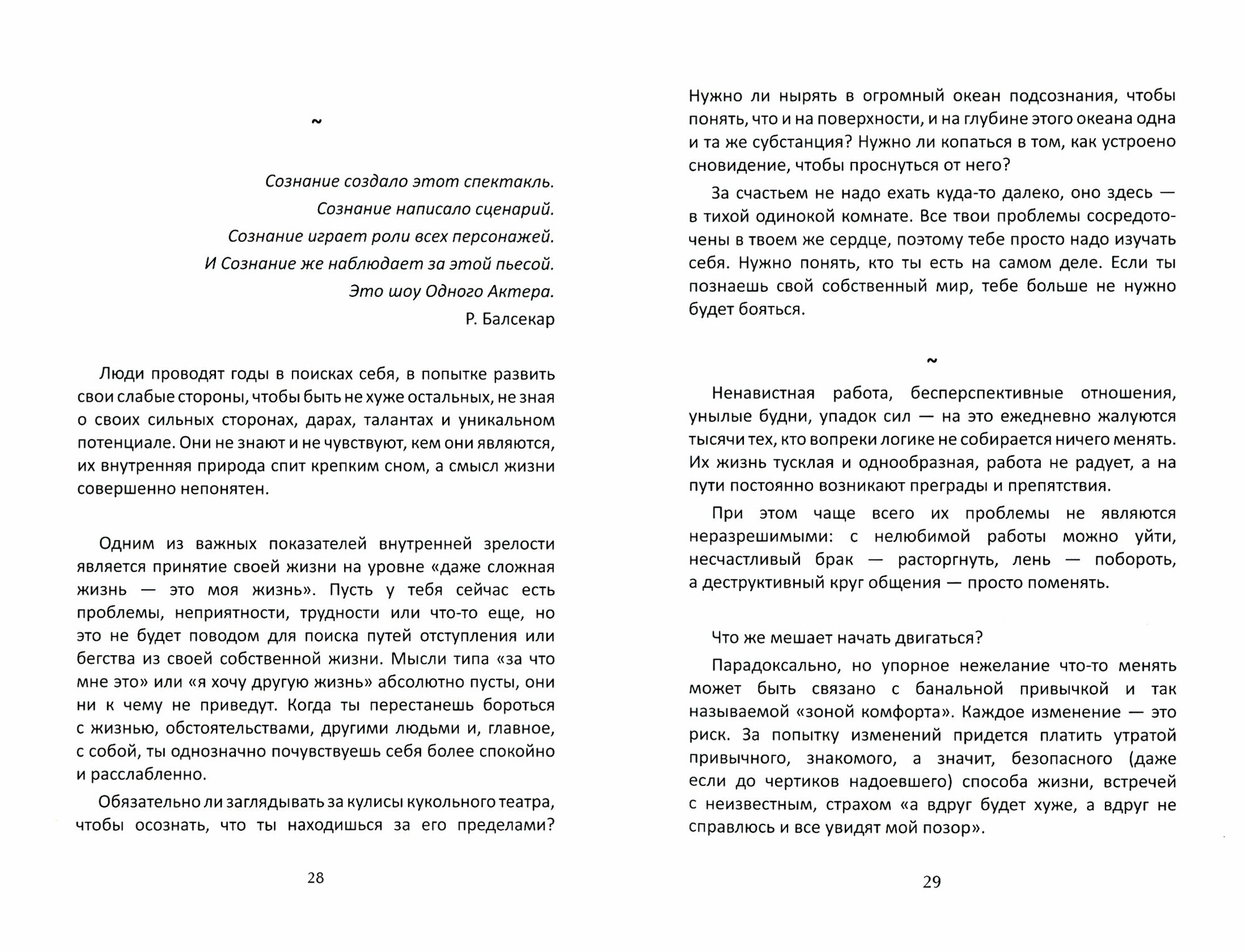 Суть саморазвития - в том, чтобы овладеть искусством осознанного творения своей жизни, меняя развитие событий, не ломая при этом "сцены" и не обвиняя "актеров" за выбранные ими роли.