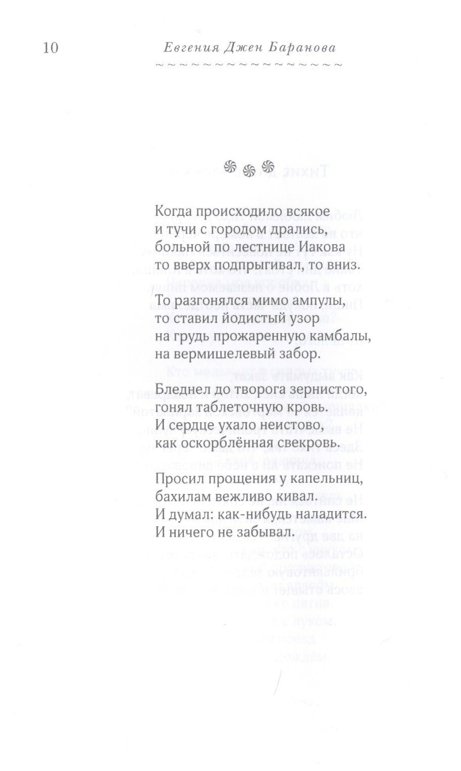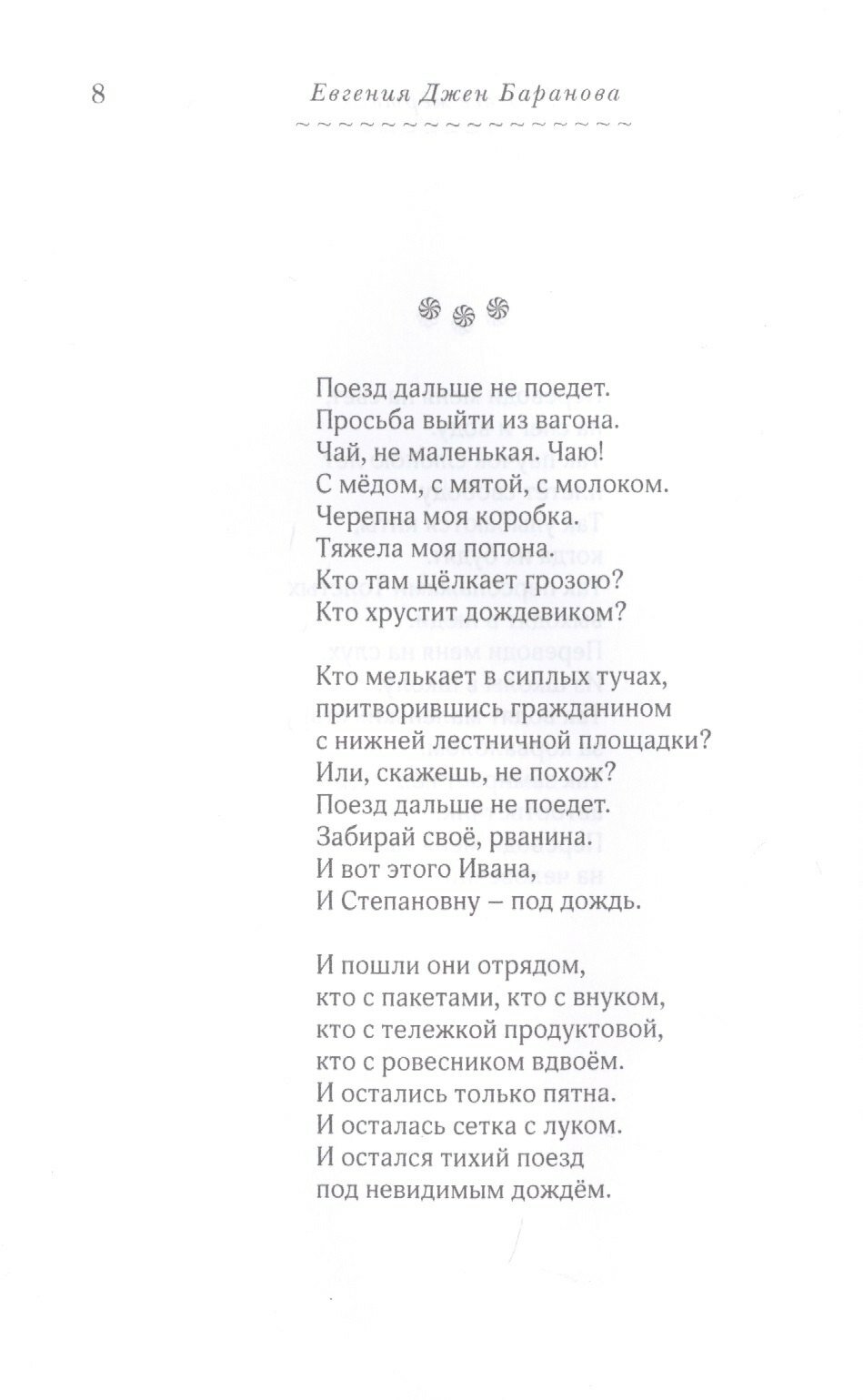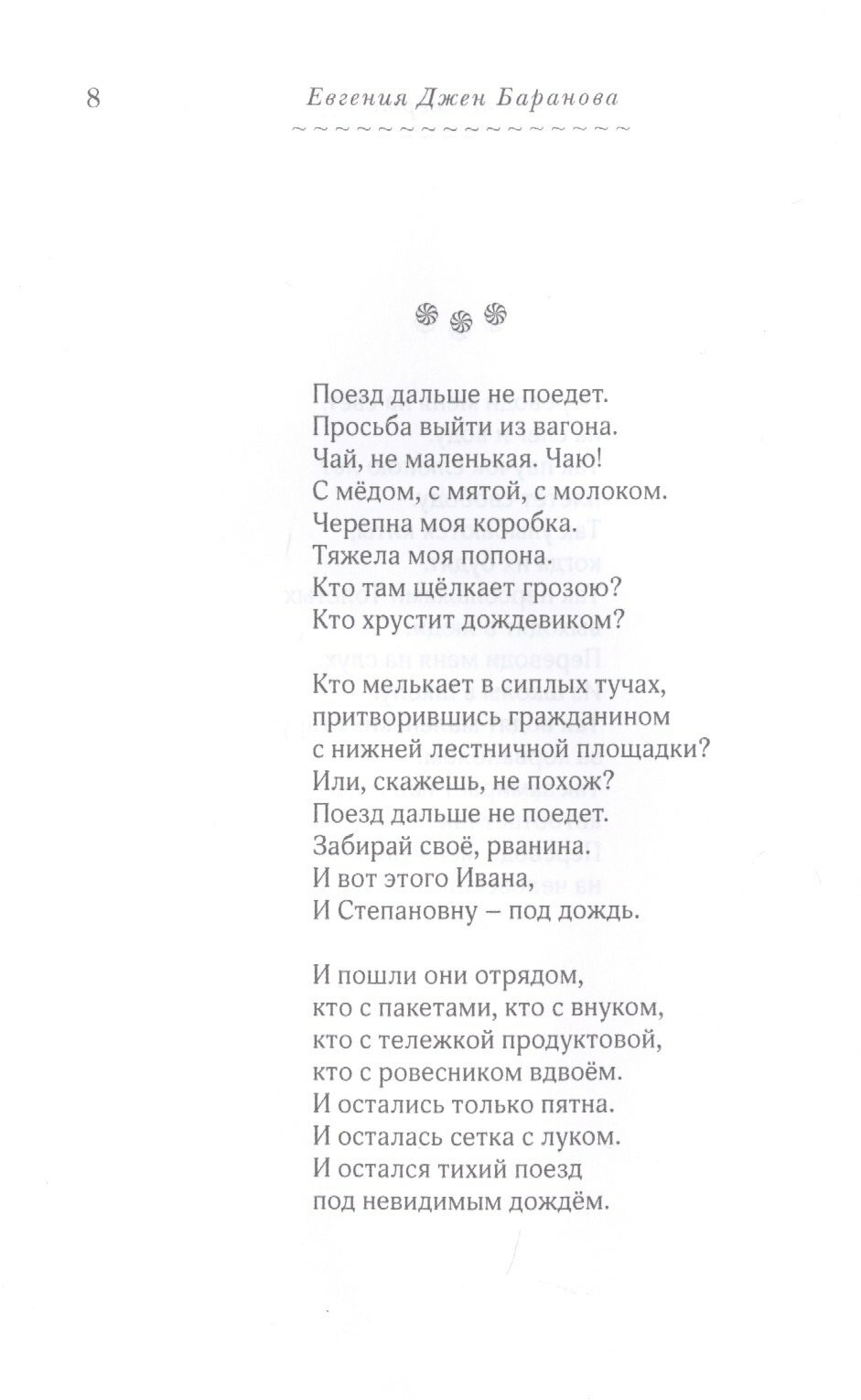Евгения Джен Баранова окончила Севастопольский национальный технический университет. Публиковалась в журналах "Дружба народов", "Prosodia", "Интерпоэзия", "Крещатик", "Homo Legens", "Юность", "Кольцо А", "Зинзивер", "Москва", "Плавучий мост", "Дальний Восток", "Дети Ра", "Южное сияние" и других. Лауреат нескольких литературных конкурсов, премии журнала "Зинзивер" (2017), премии имени В. П. Астафьева (2018), премии журнала "Дружба народов" (2019). Финалист премии "Лицей" (2019), обладатель спецприза журнала "Юность" (2019). Автор трех поэтических сборников, в том числе книги стихов "Рыбное место" (СПб., Алетейя, 2017).