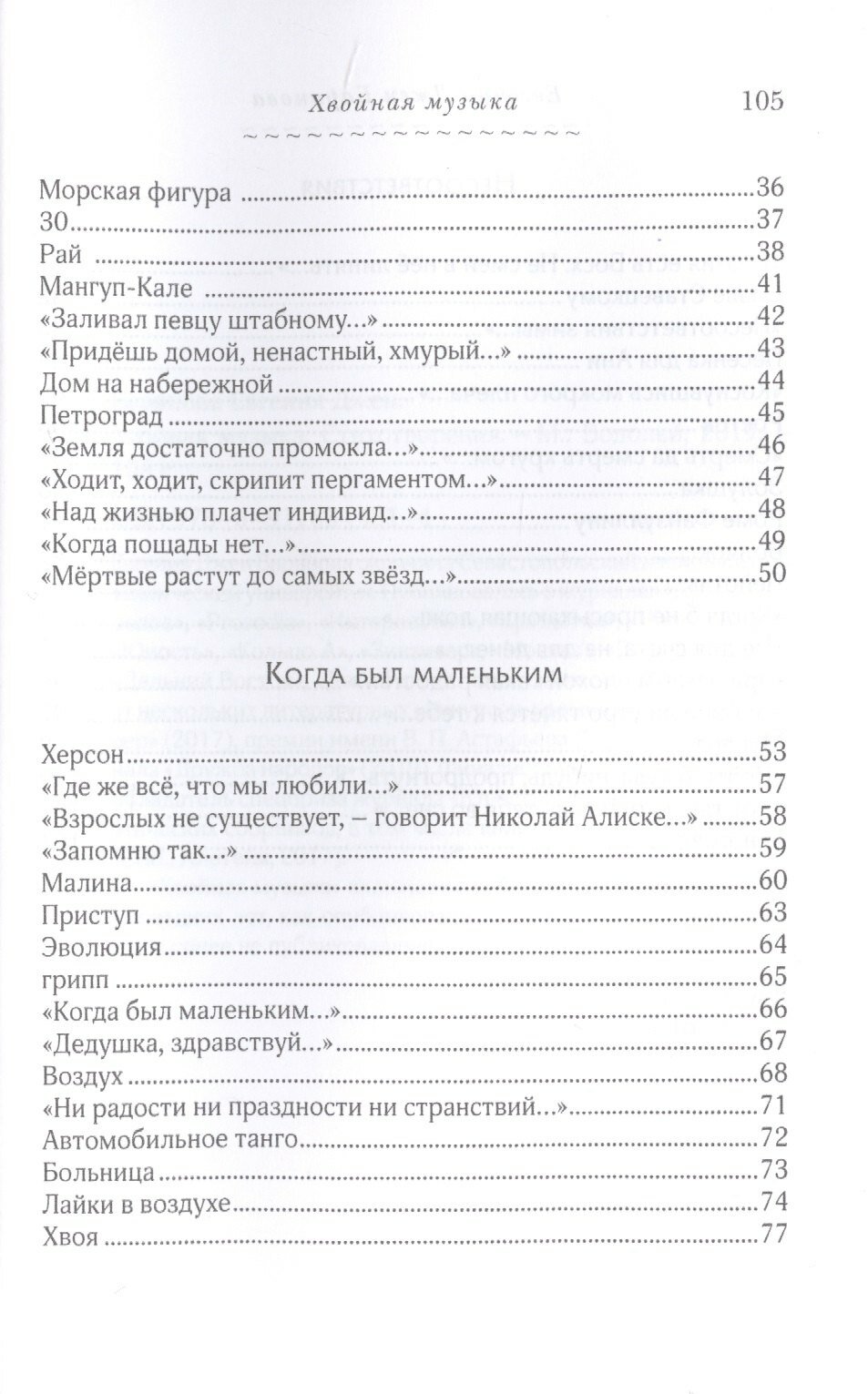 "Хвойная музыка" включает в себя поэтические тексты трех последних лет, как опубликованные в литературных журналах, так и ранее не публиковавшиеся.