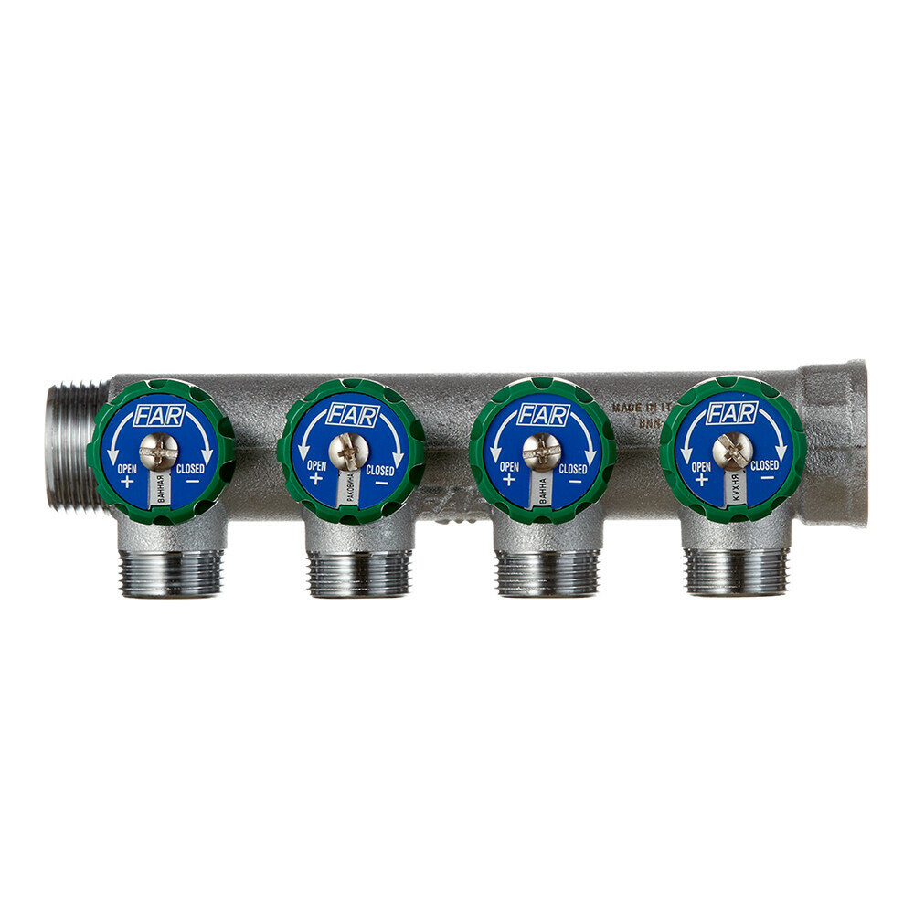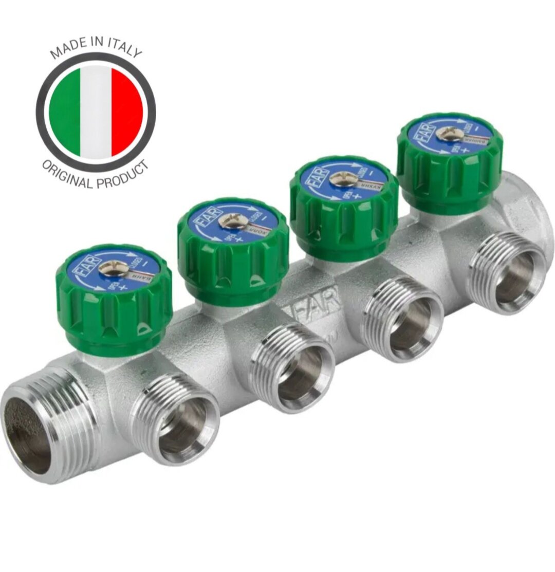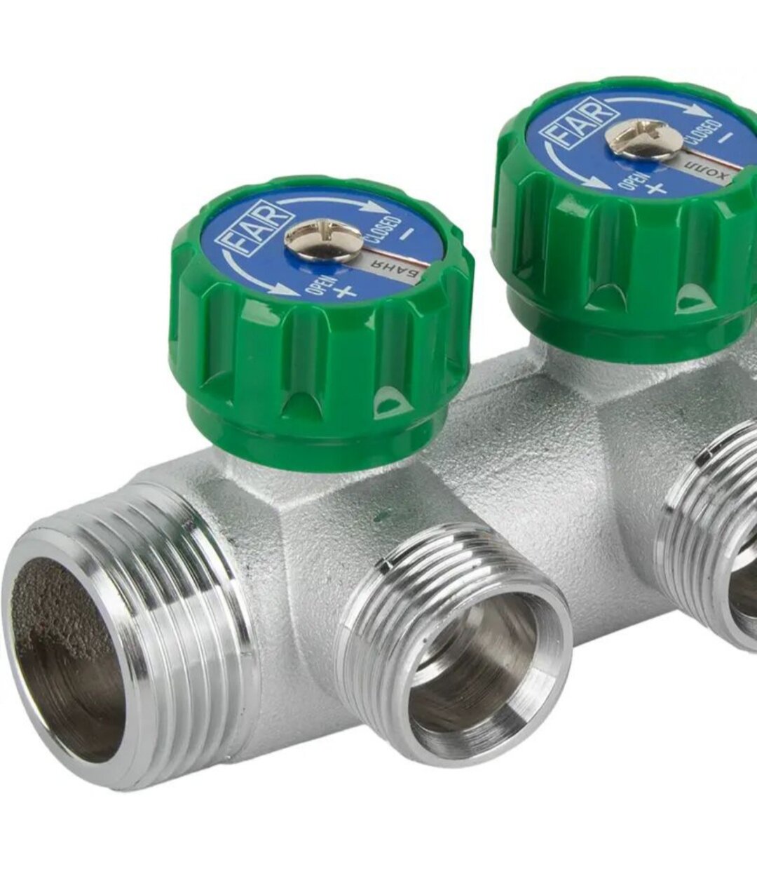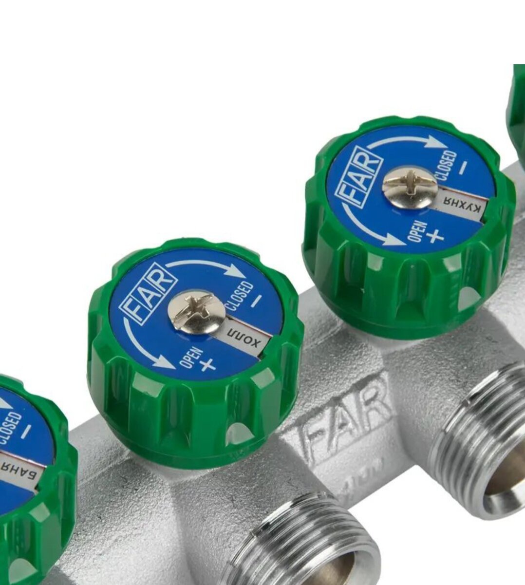 Распределительный коллектор Far MultiFar регулирующий, проходной, с четырьмя отводами, плоское уплотнение Flat Faced. Двухсторонние сине-красные вкладыши для ручек регулирующих вентилей. Специальное отверстие на вкладыше в которое можно установить наименования помещений с помощью вторичных вкладышей.
