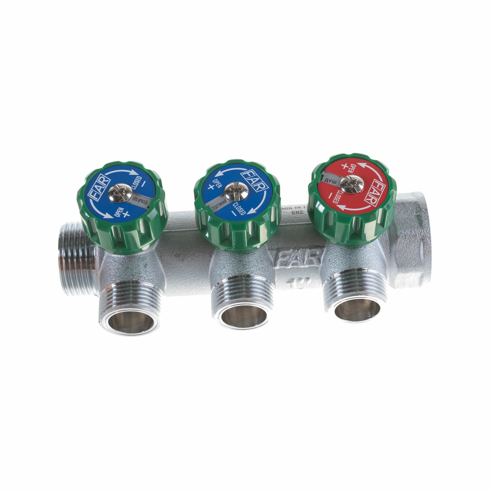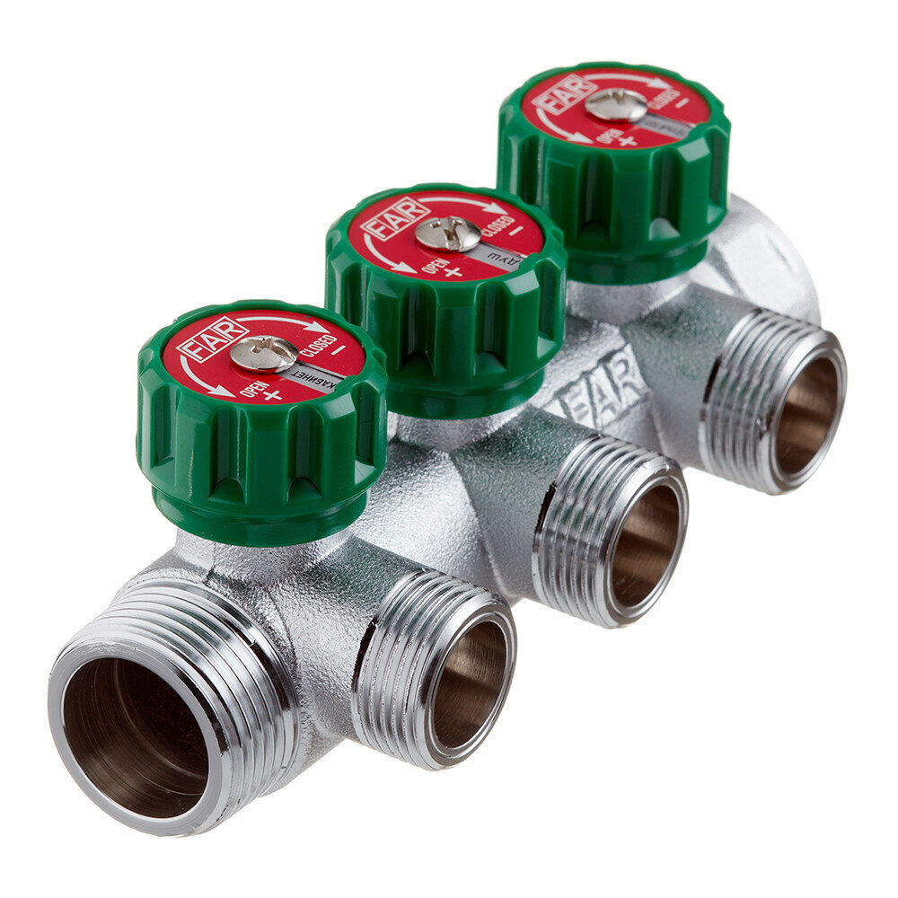Распределительный коллектор Far MultiFar регулирующий, проходной, с тремя отводами, плоское уплотнение Flat Faced. Двухсторонние сине-красные вкладыши для ручек регулирующих вентилей. Специальное отверстие на вкладыше в которое можно установить наименования помещений с помощью вторичных вкладышей.