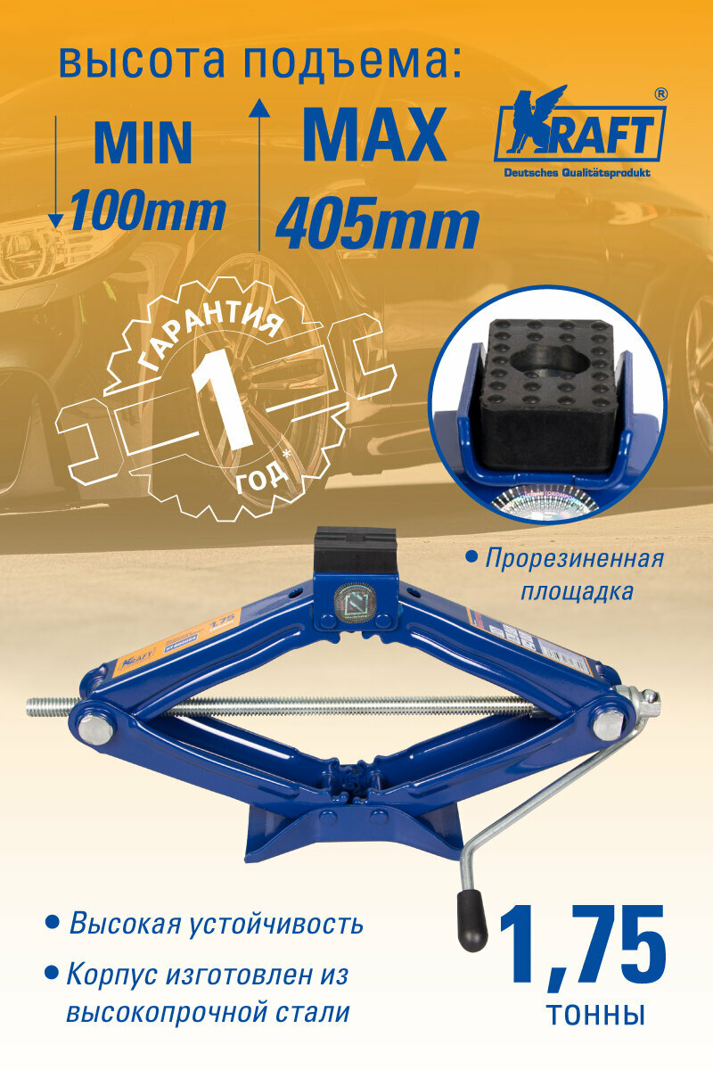 Аксессуары Kraft Механический ромбический домкрат Kraft изготовлен из высококачественного металла и предназначен для работы с грузами массой до 1.75 тонн. Он имеет продуманную конструкцию и очень удобен в обращении. Минимальная высота подхвата домкрата 100 мм, а максимальная высота подъема 405 мм. Kraft можно использовать в качестве подъемного механизма при обслуживания легковых автомобилей.