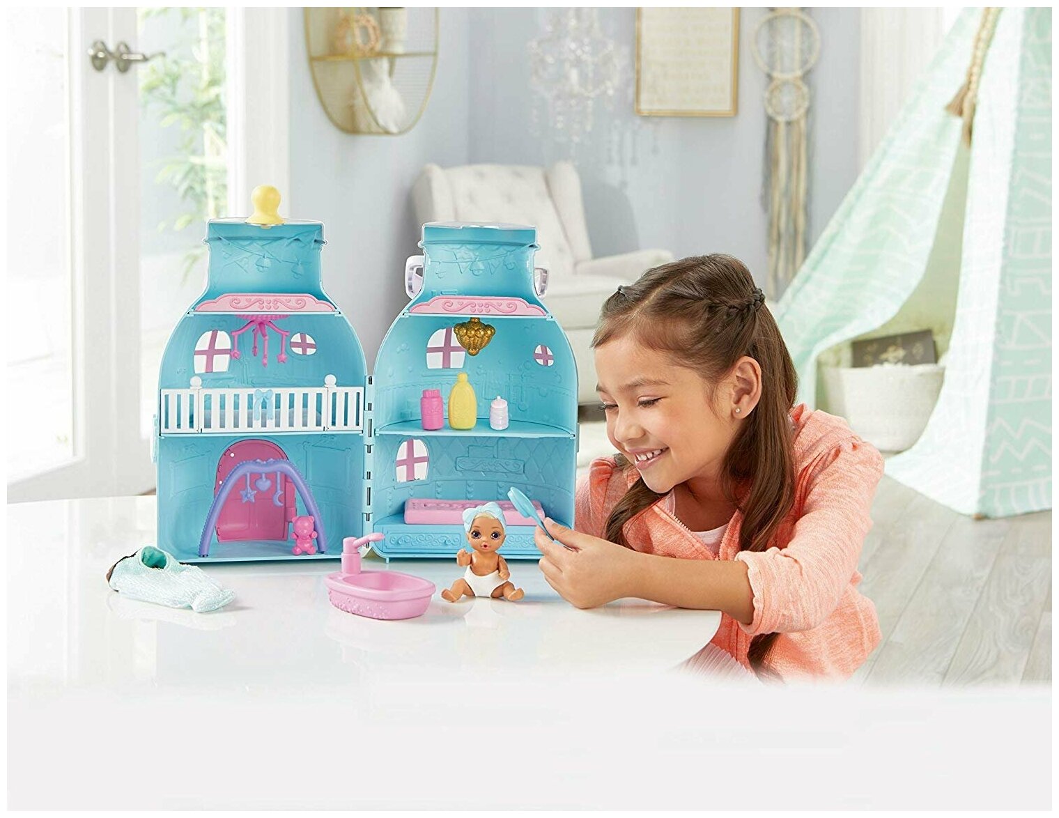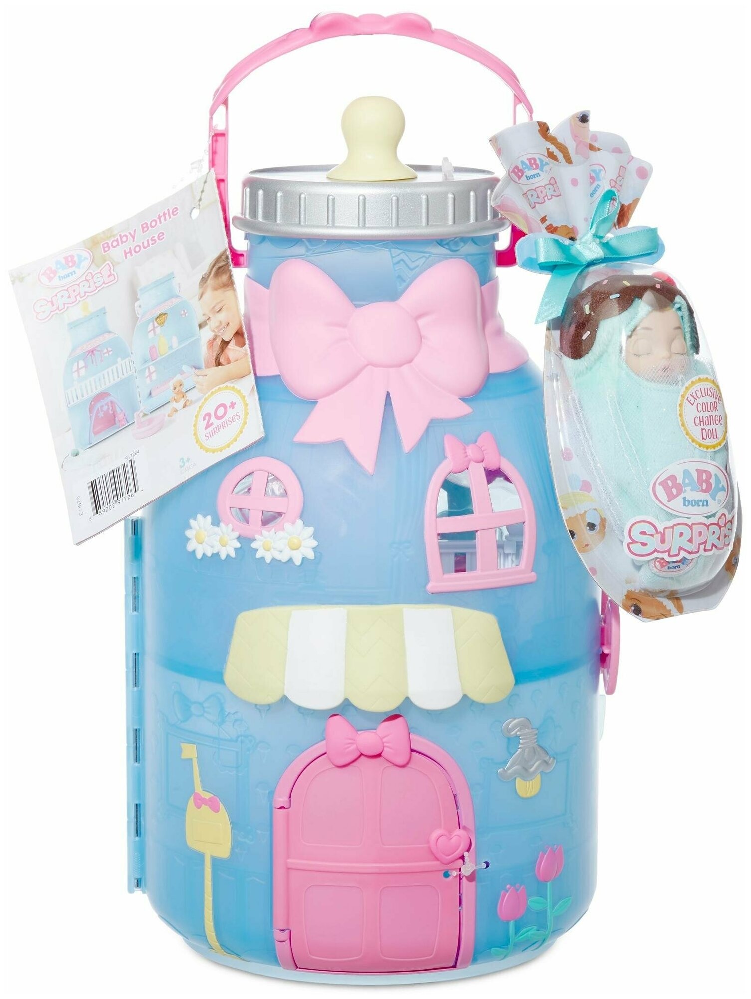 Аксессуар для игр с куклами Baby Born Surprise. Модель представляет собой небольшой кукольный домик в виде открывающейся полой бутылки с соской наверху, а также небольшой ручкой. Бутылочка раскрывается пополам и позволяет взглянуть внутрь, где располагаются 4 комнаты: две игровые, ванная и спальня.