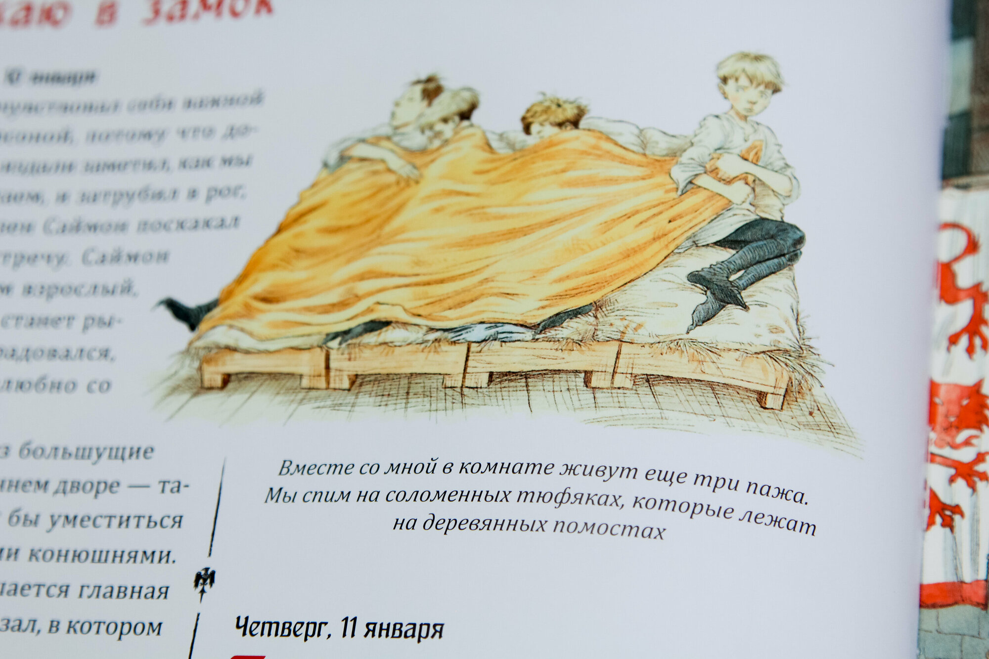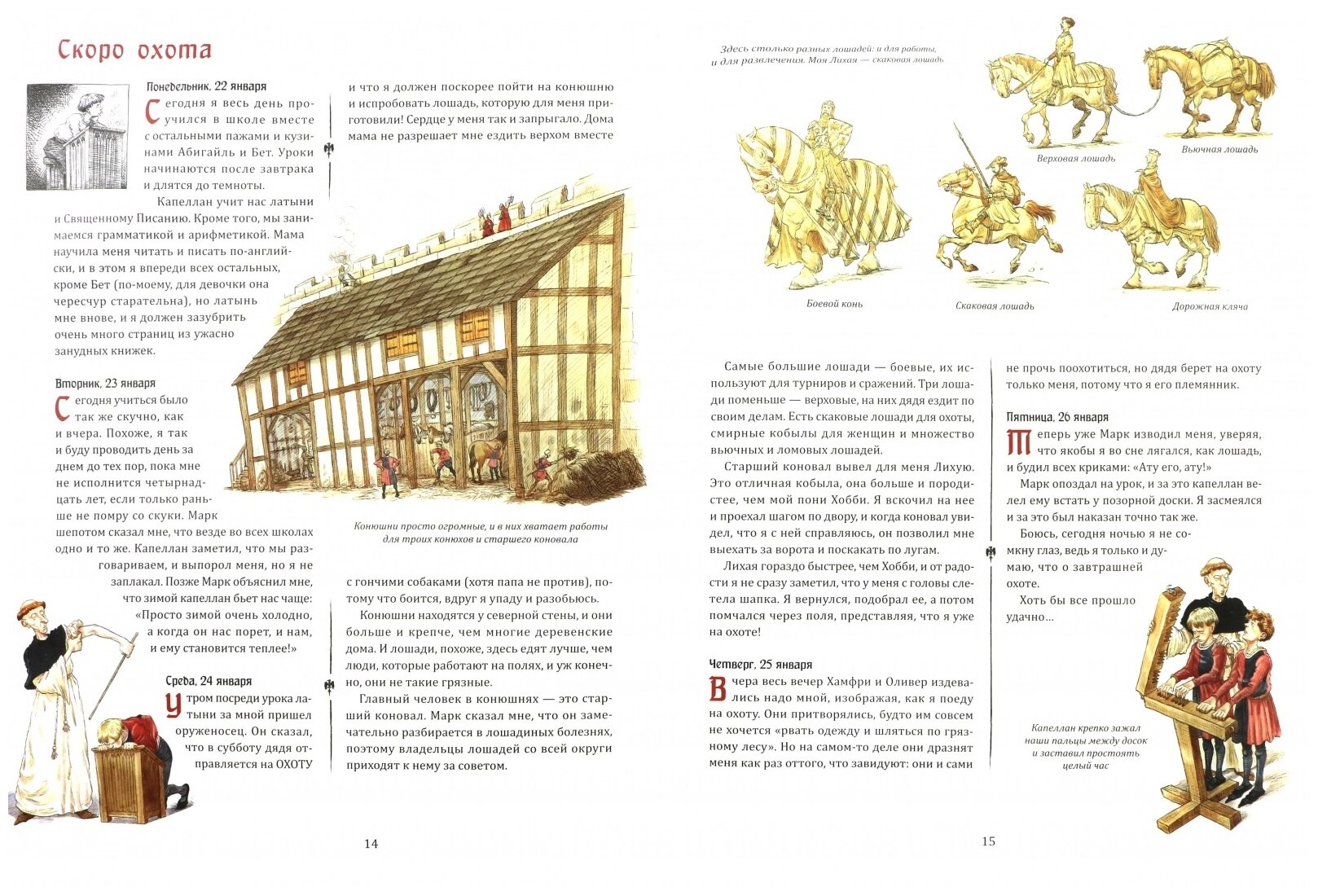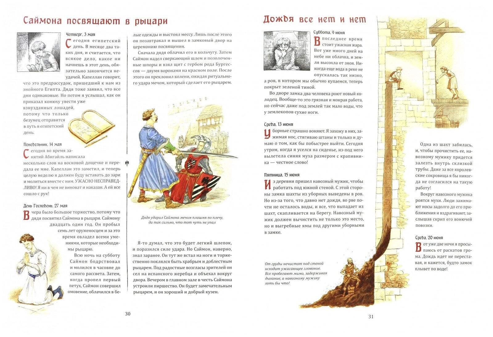 Согласна, что эта книга очень информативна и, что важно, без прямо сильной-сильной романтизации эпохи, а здесь описаны: охота, жатва, рыцарство, турниры. Но еще не все, потому что рассказывается о том, как происходили суды, пиры, праздники, а еще немного о медицине. И, конечно, суровый процесс обучения всему. А еще в ней смешные и забавные иллюстрации, текст они дополняют прекрасно.