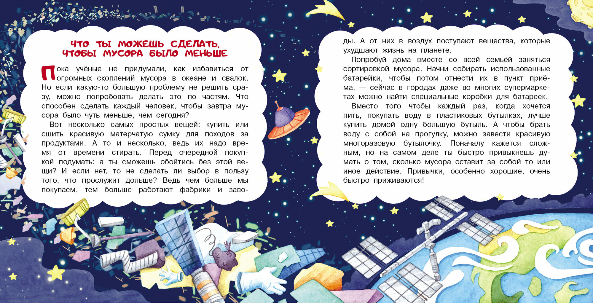 Это наша вторая книга данного автора, я купила ее изначально даже больше для себя, так как тема сортировки и переработки мусора меня интересовала давно. А тут простым языком, доходчиво и наглядно, можно узнать о судьбе мусора как обычного, так и космического, о чем я, взрослая женщина, даже и не догадывалась. По возрасту я бы рекомендовала для детей от 4 лет, дочке в 2,5 года больше интересно рассматривать красочные картинки, но теперь сама рвется выбрасывать мусор и отдельно складывает пластиковые бутылки в мешок. По качеству это тонкие листы, мягкая обложка, поэтому я бы купила только по акции, без нее цена завышена.