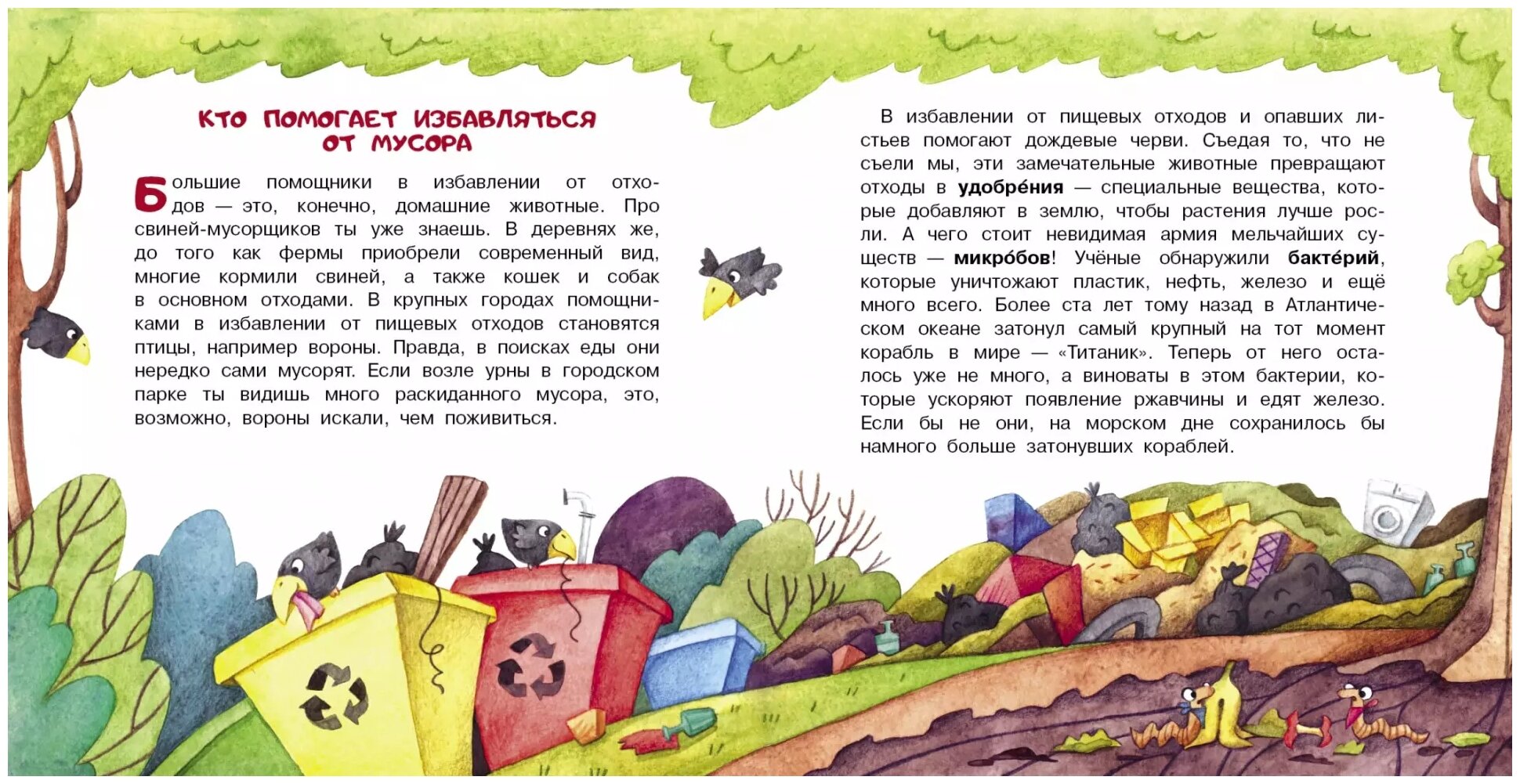 Хорошая красочная книжка в мягкой обложке, с плотной бумагой хорошего качества. Приятные иллюстрации, крупный шрифт, относительно простой текст. И очень важная для современного мира тема: избыток мусора и его переработка.